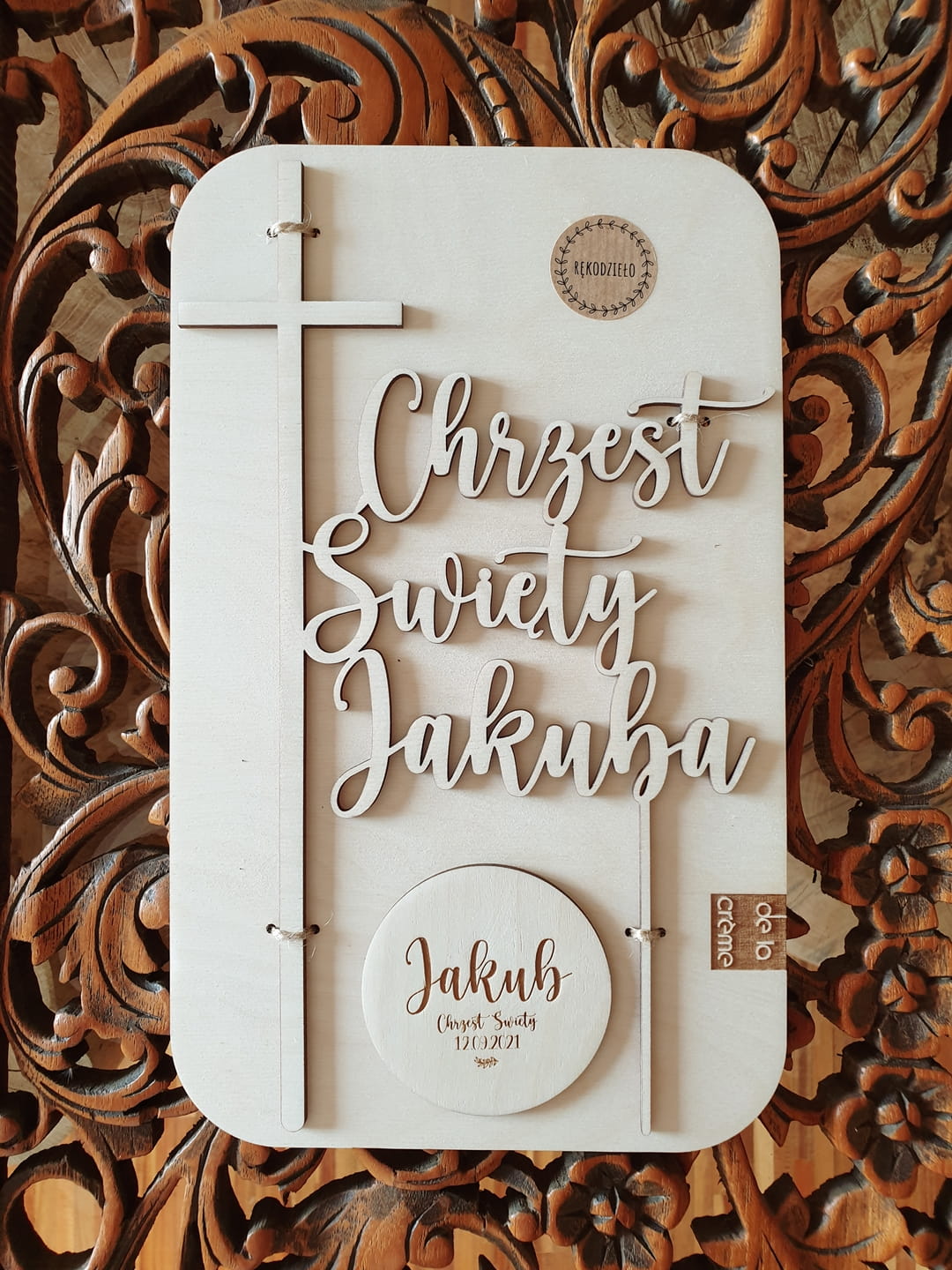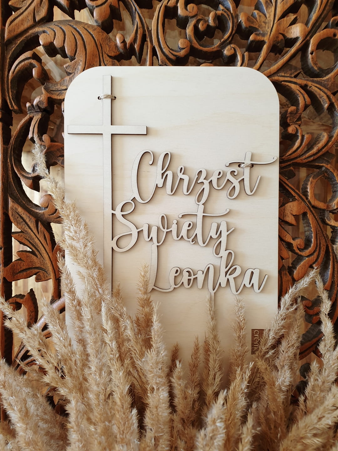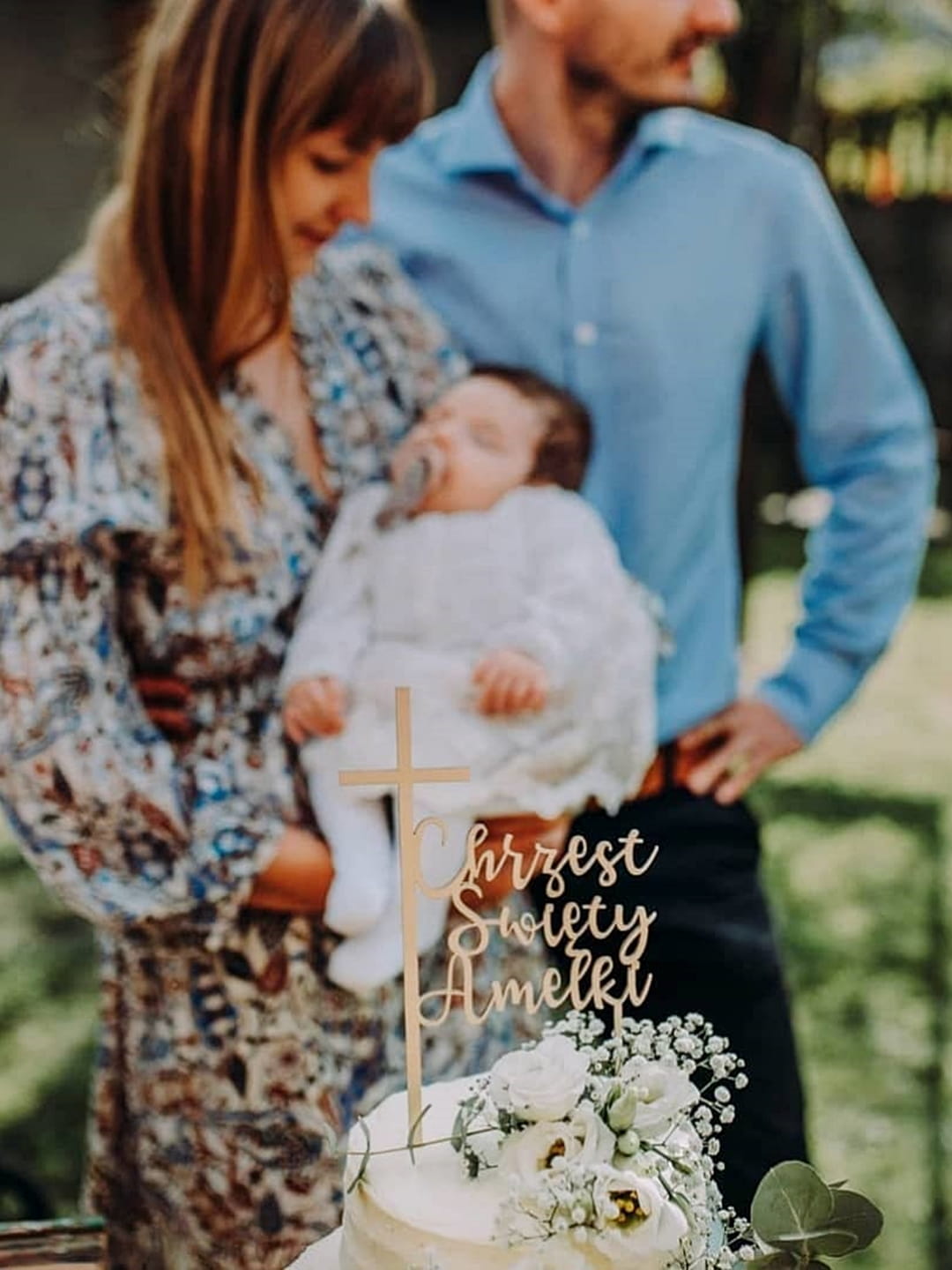 Delikatny, drewniany topper na przyjęcie z okazji Chrztu Świętego.