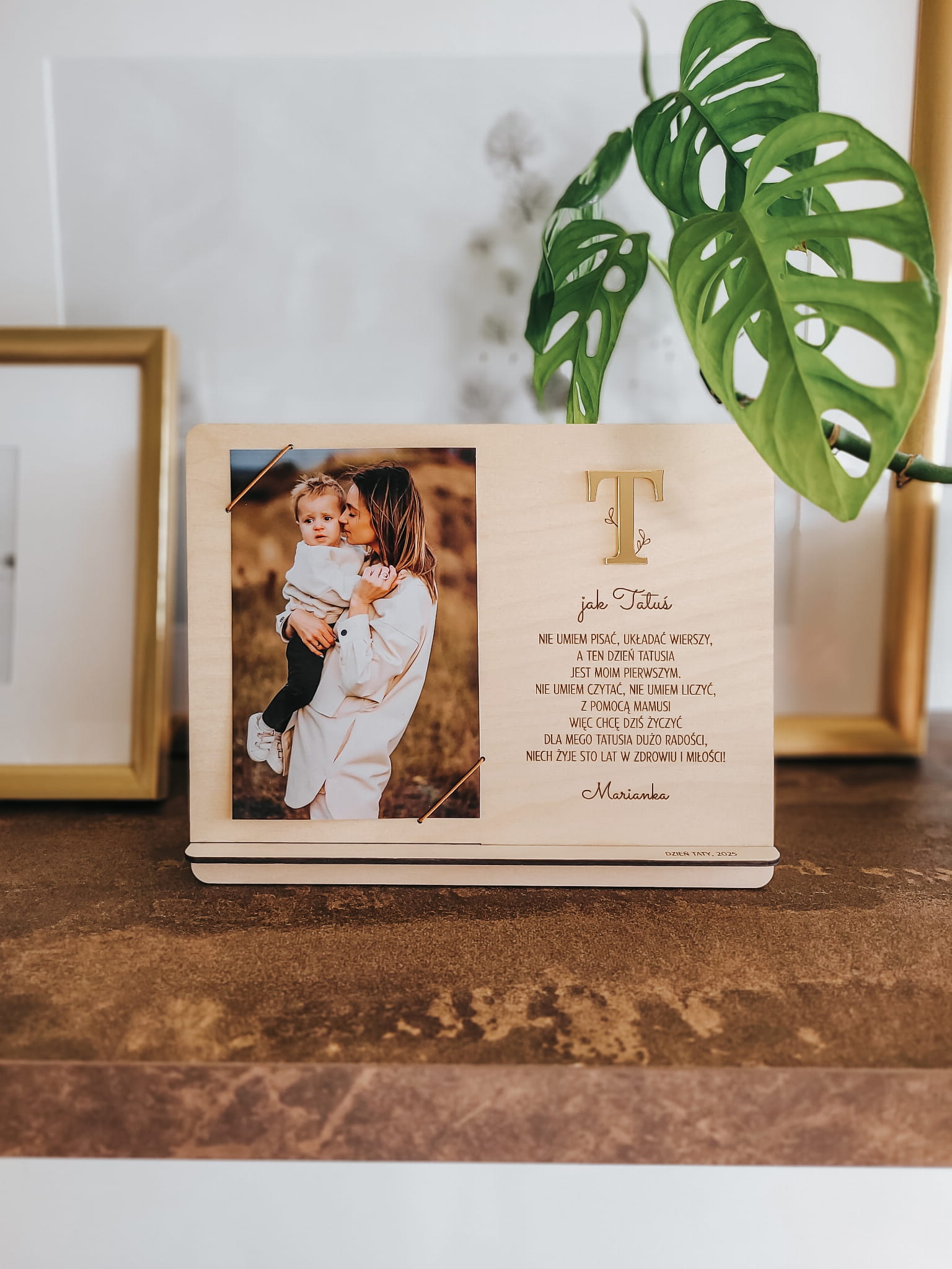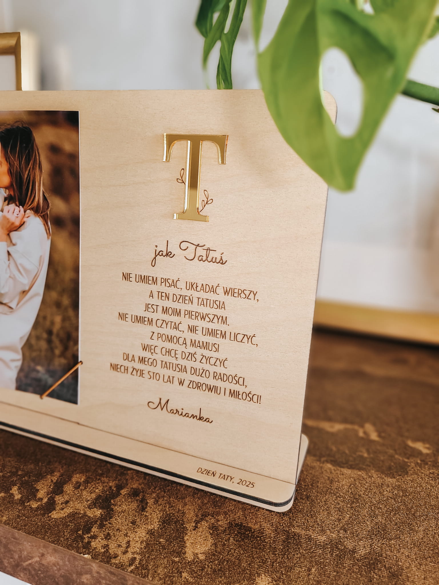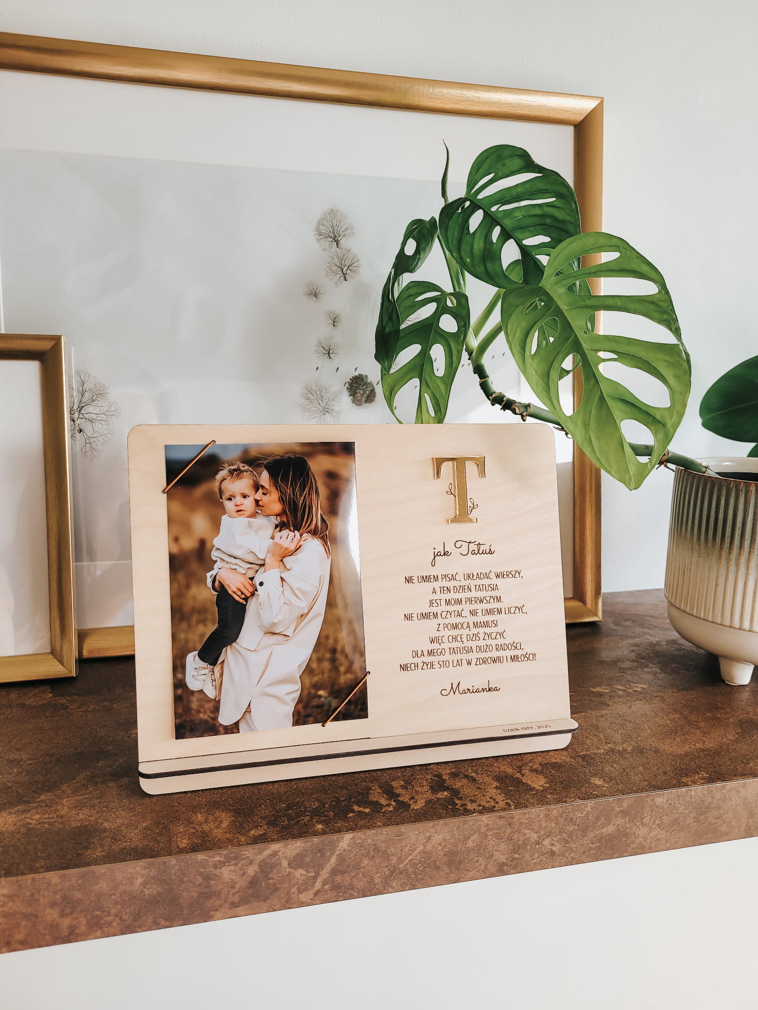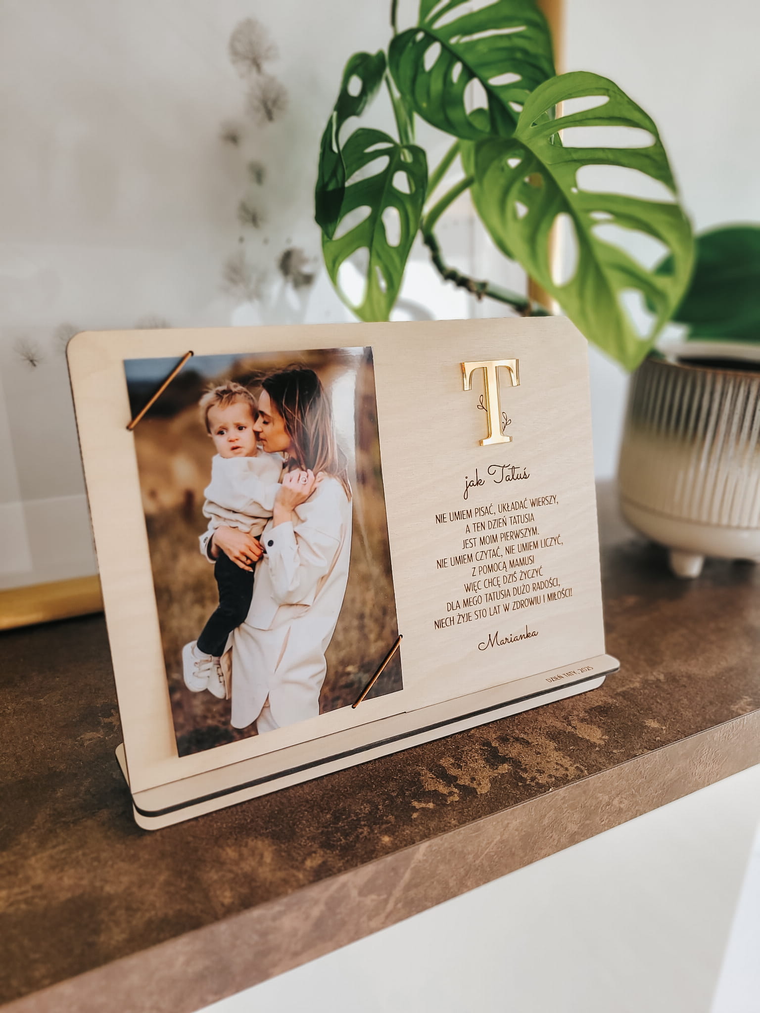 Drewniana ramka okolicznościowa do postawienia na półce z miejscem na zdjęcie*, elegancką złotą literką, dowolnymi życzeniami i podpisem osoby obdarowującej.