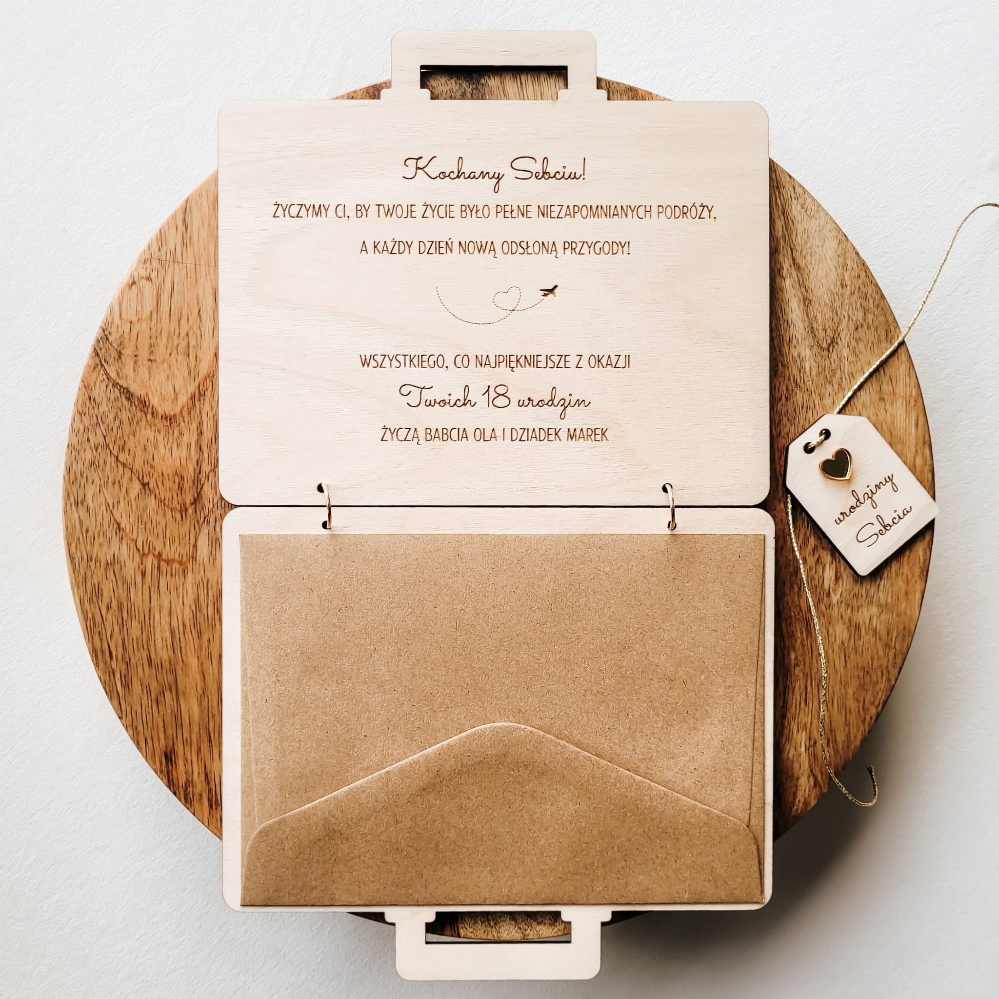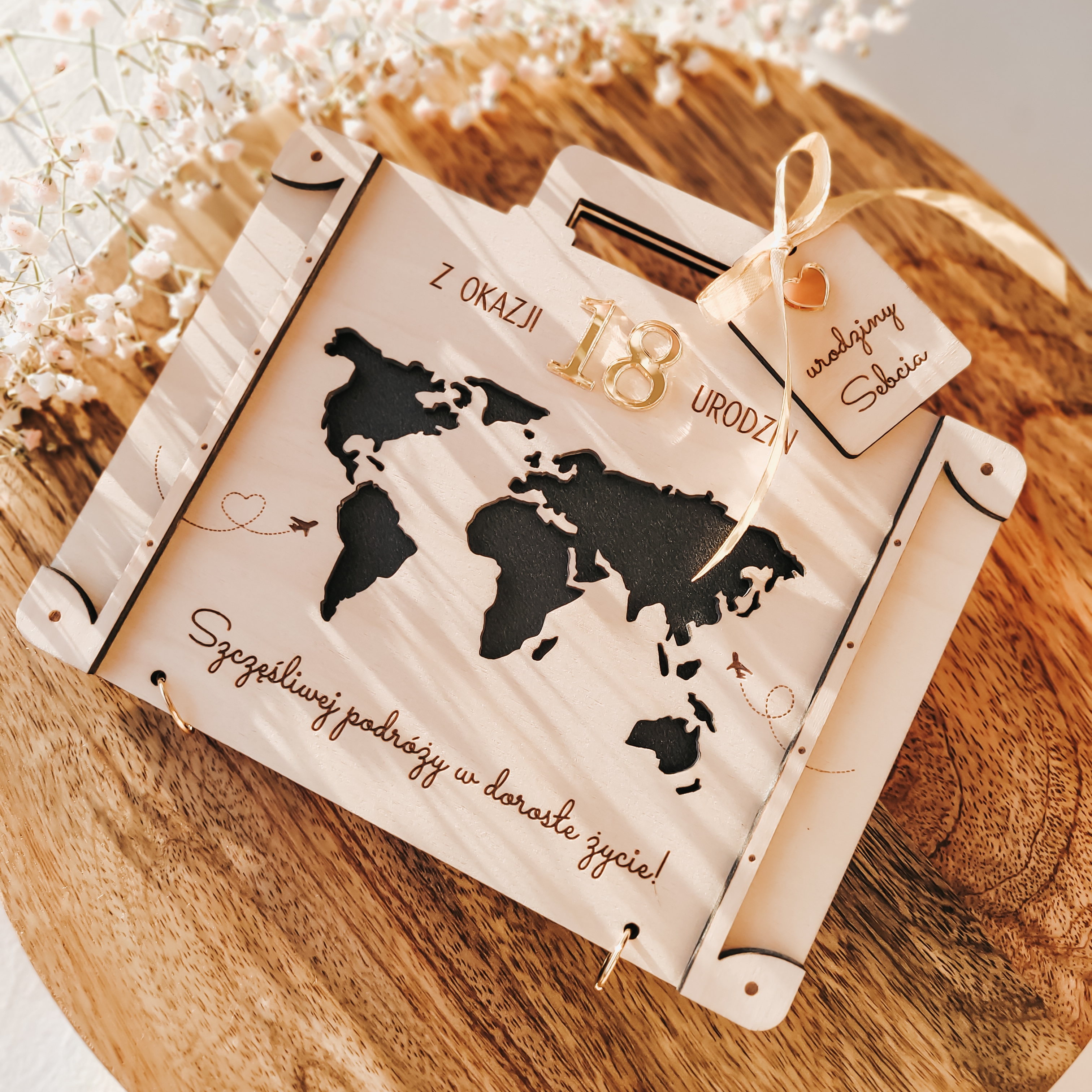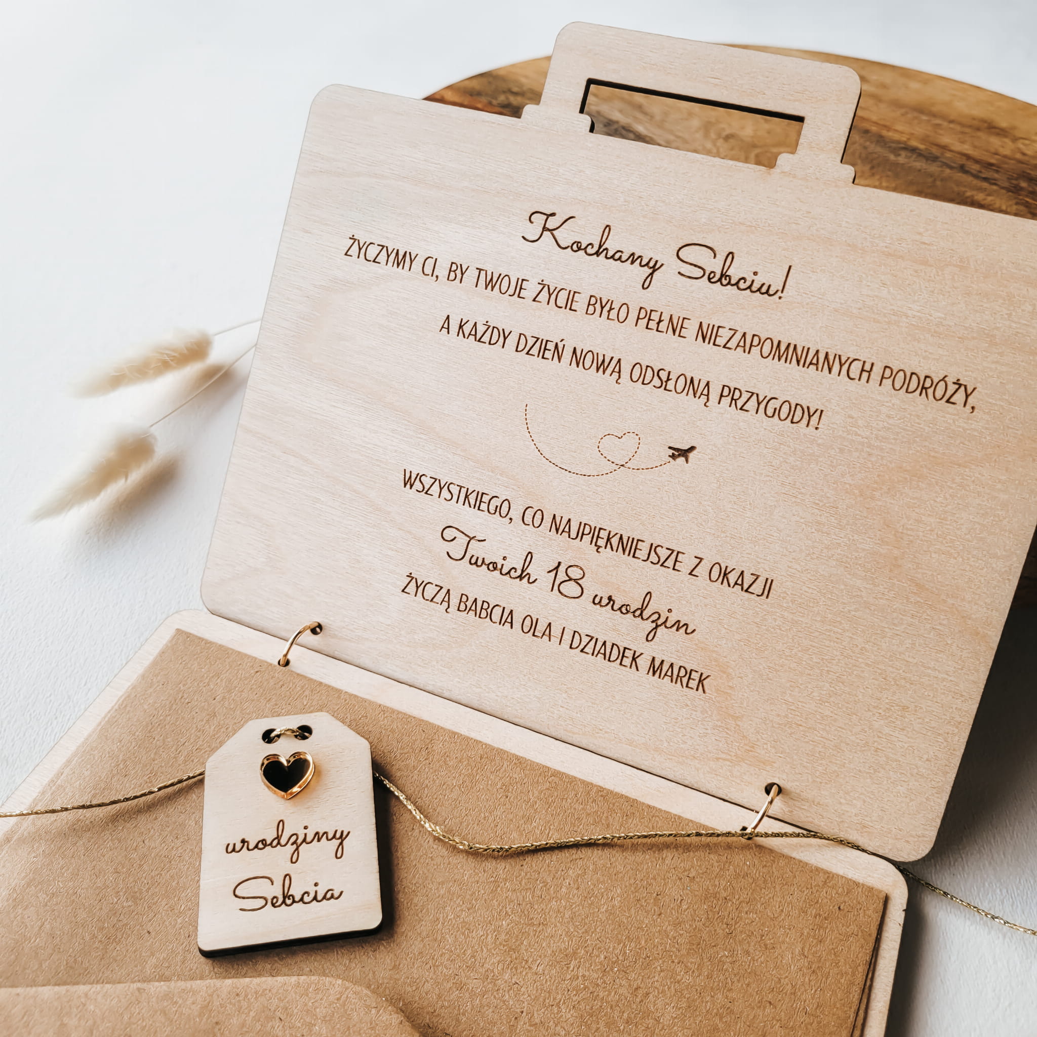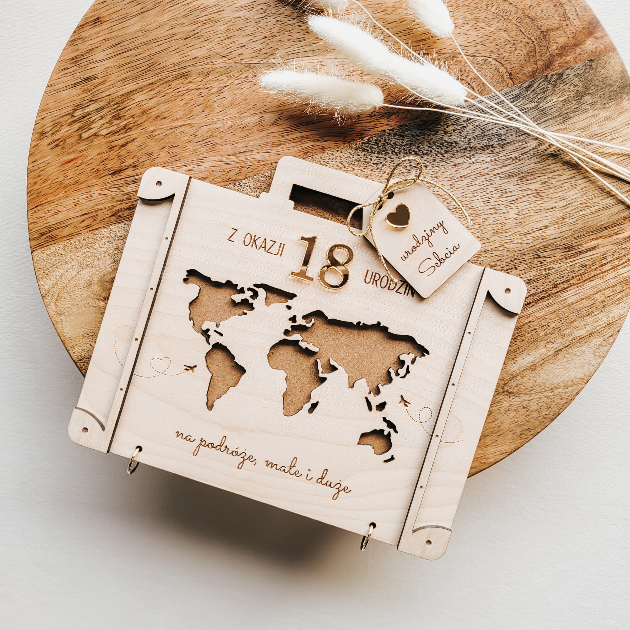Drewniana walizka z personalizowaną dedykacją i kopertą na pieniądze lub voucher to wyjątkowy sposób na wręczenie prezentu w duchu przygody!