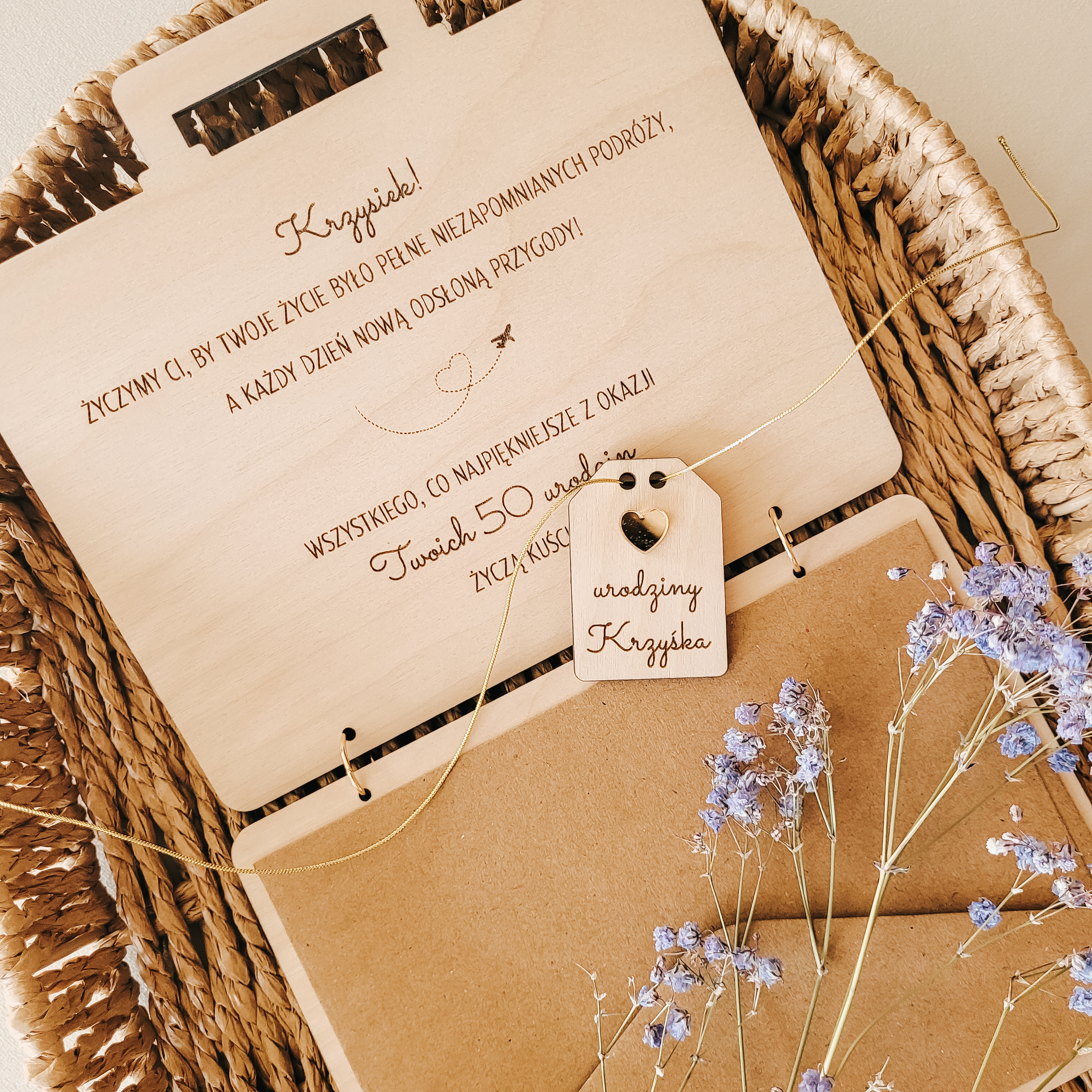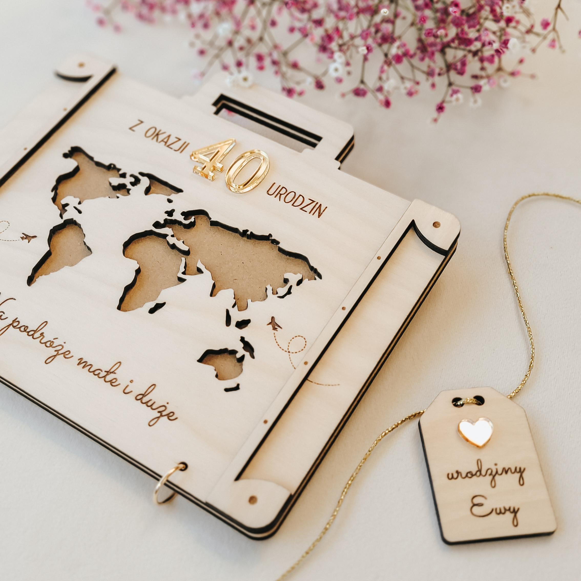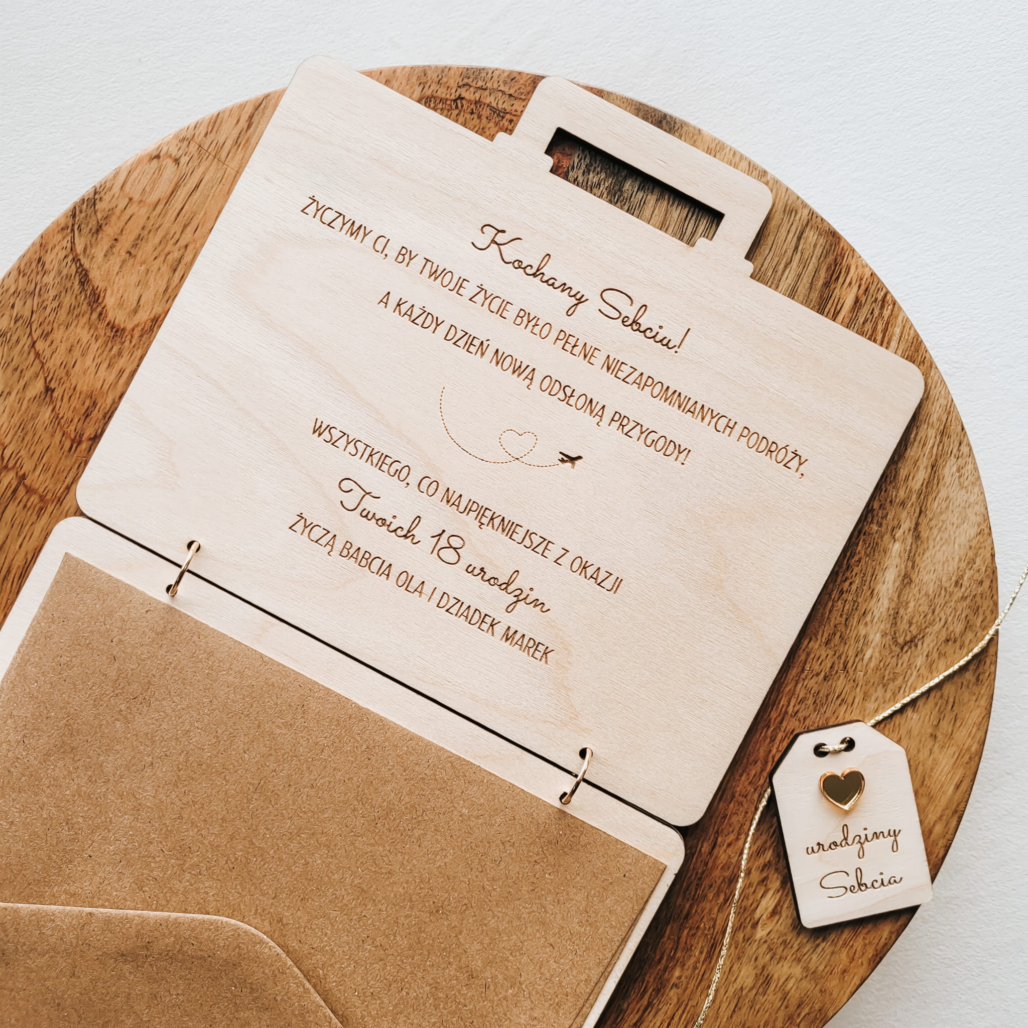 Drewniana walizka z personalizowaną dedykacją i kopertą na pieniądze lub voucher to wyjątkowy sposób na wręczenie prezentu w duchu przygody!