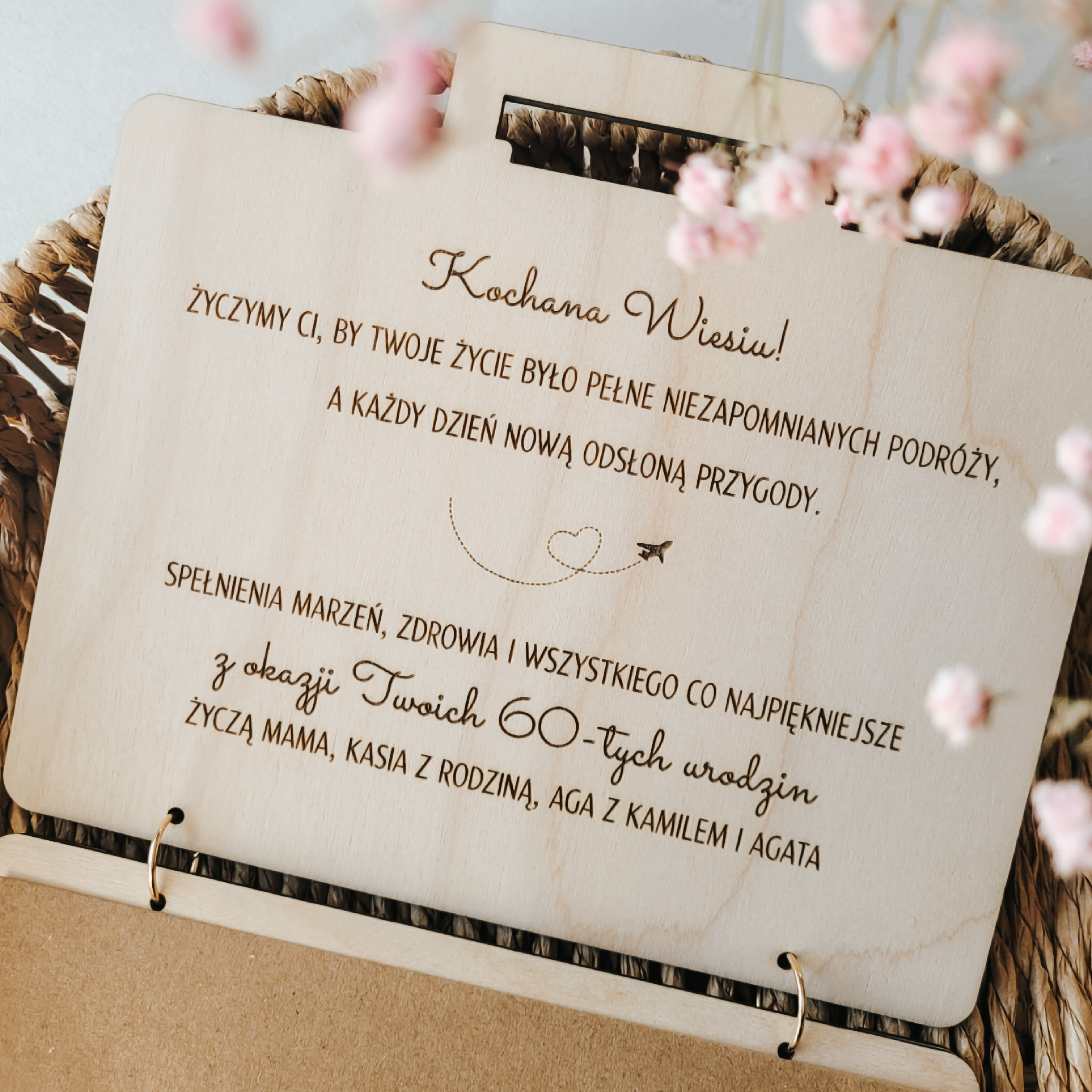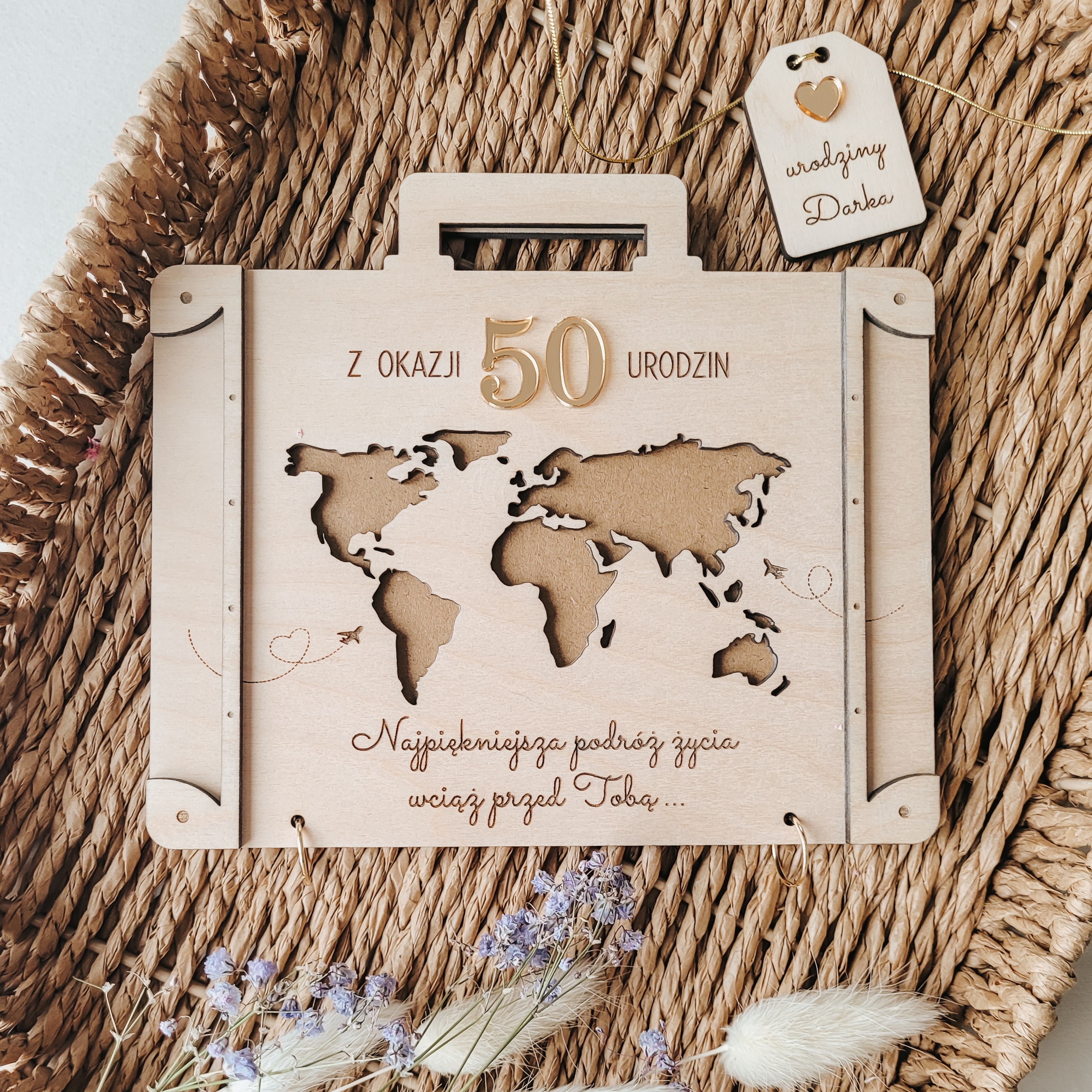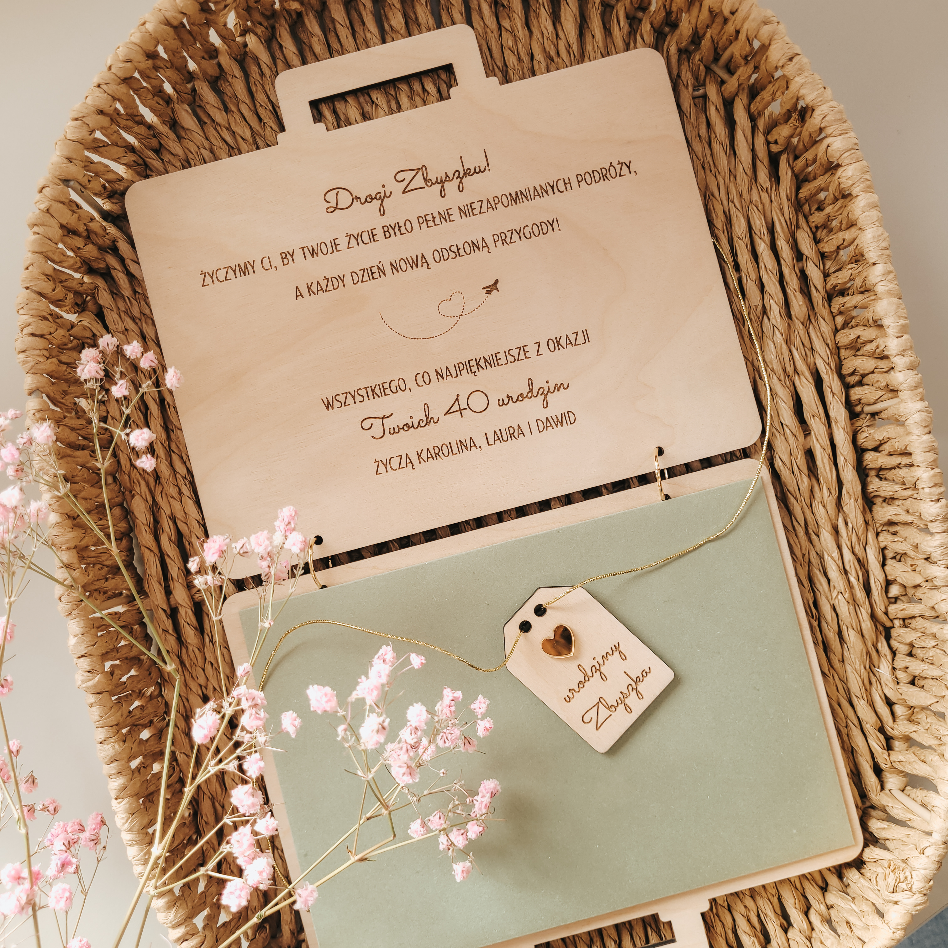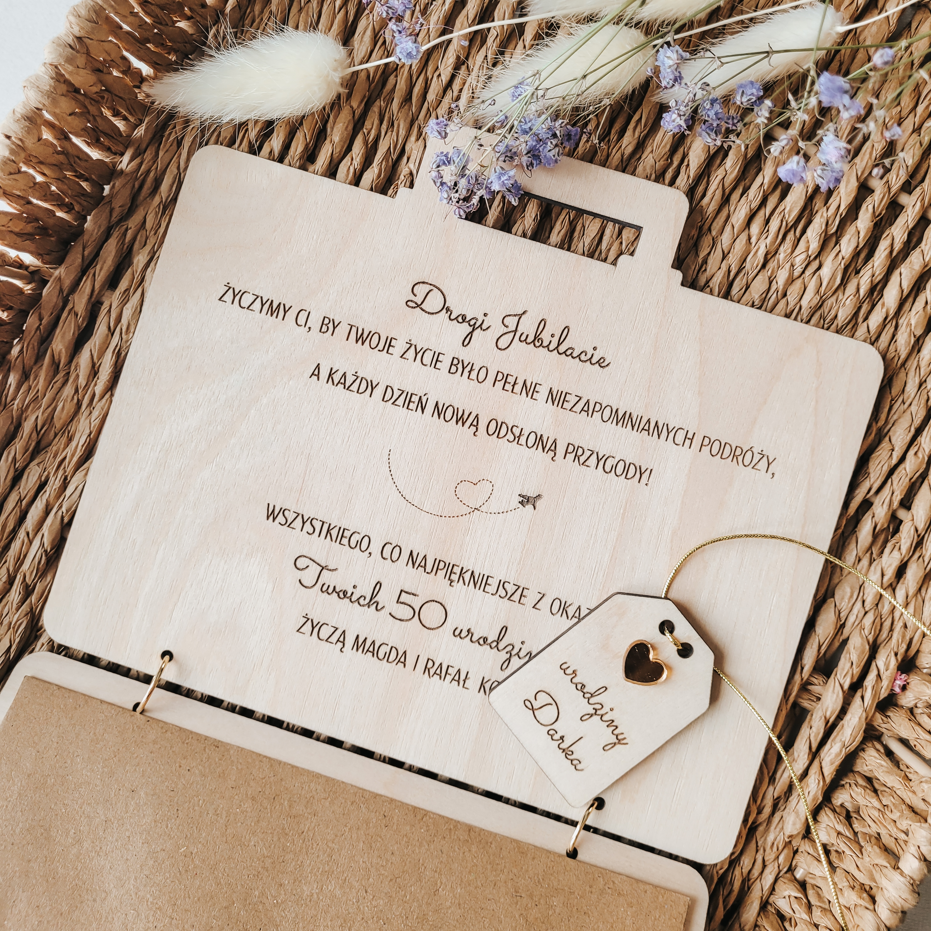 Drewniana walizka z personalizowaną dedykacją i kopertą na pieniądze lub voucher to wyjątkowy sposób na wręczenie prezentu w duchu przygody!