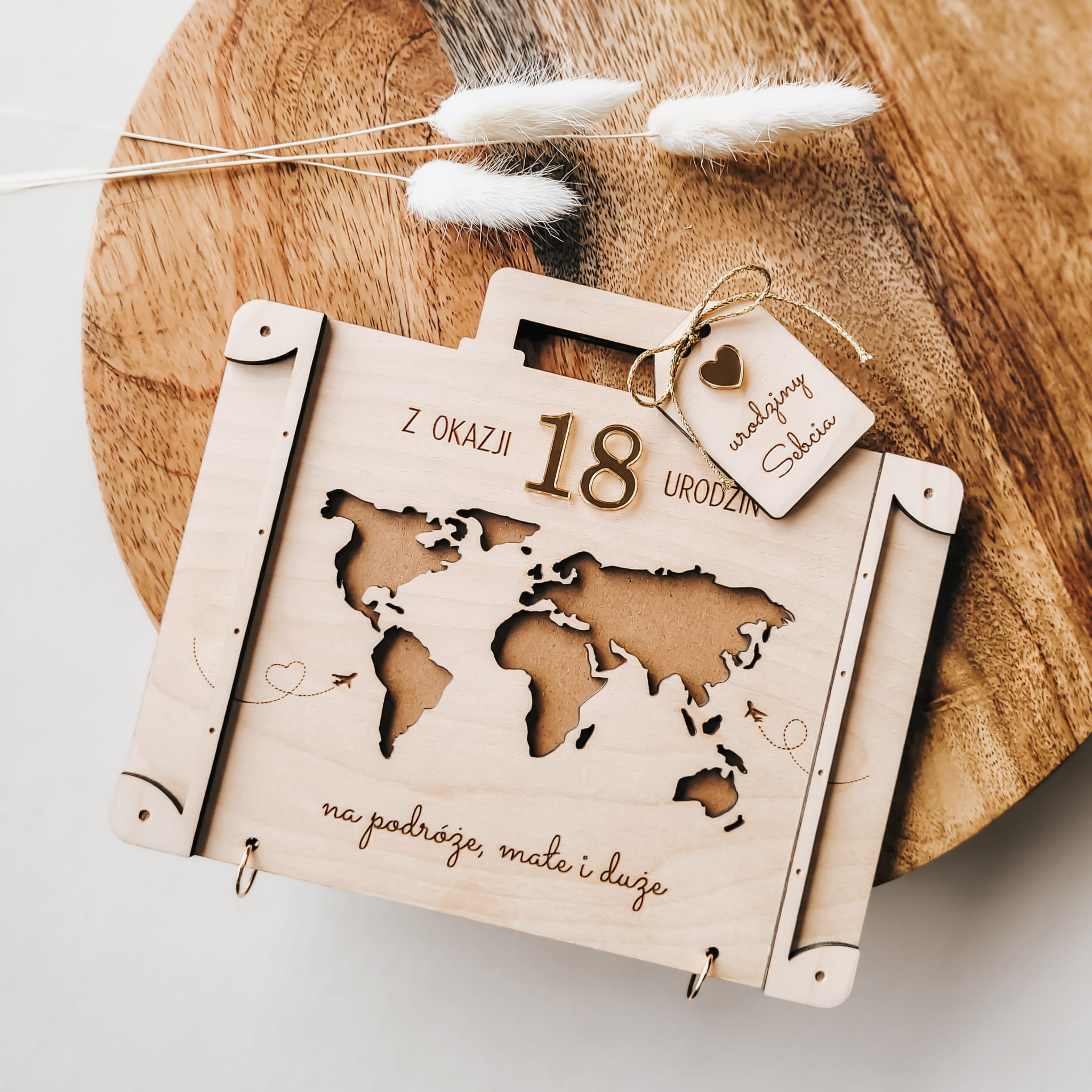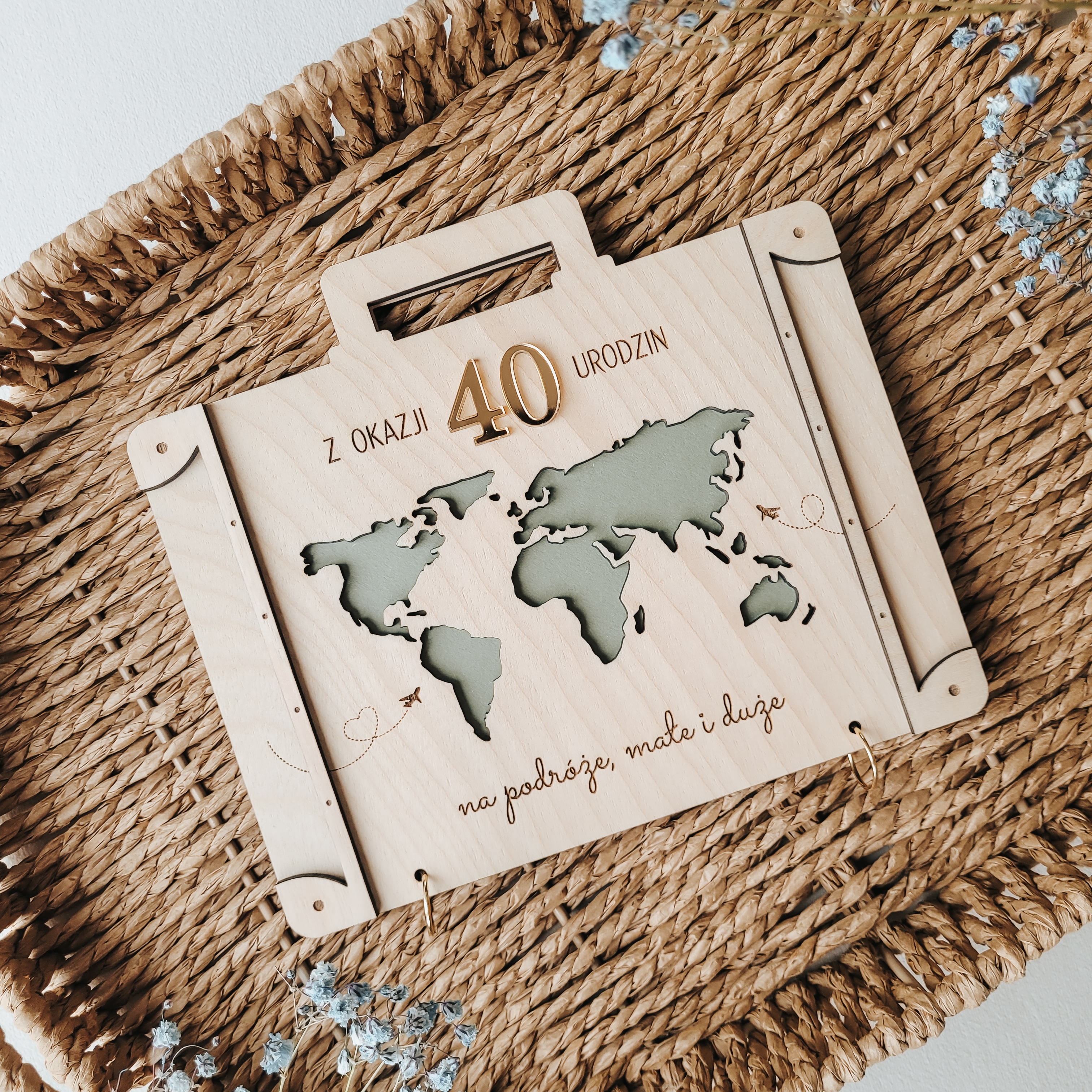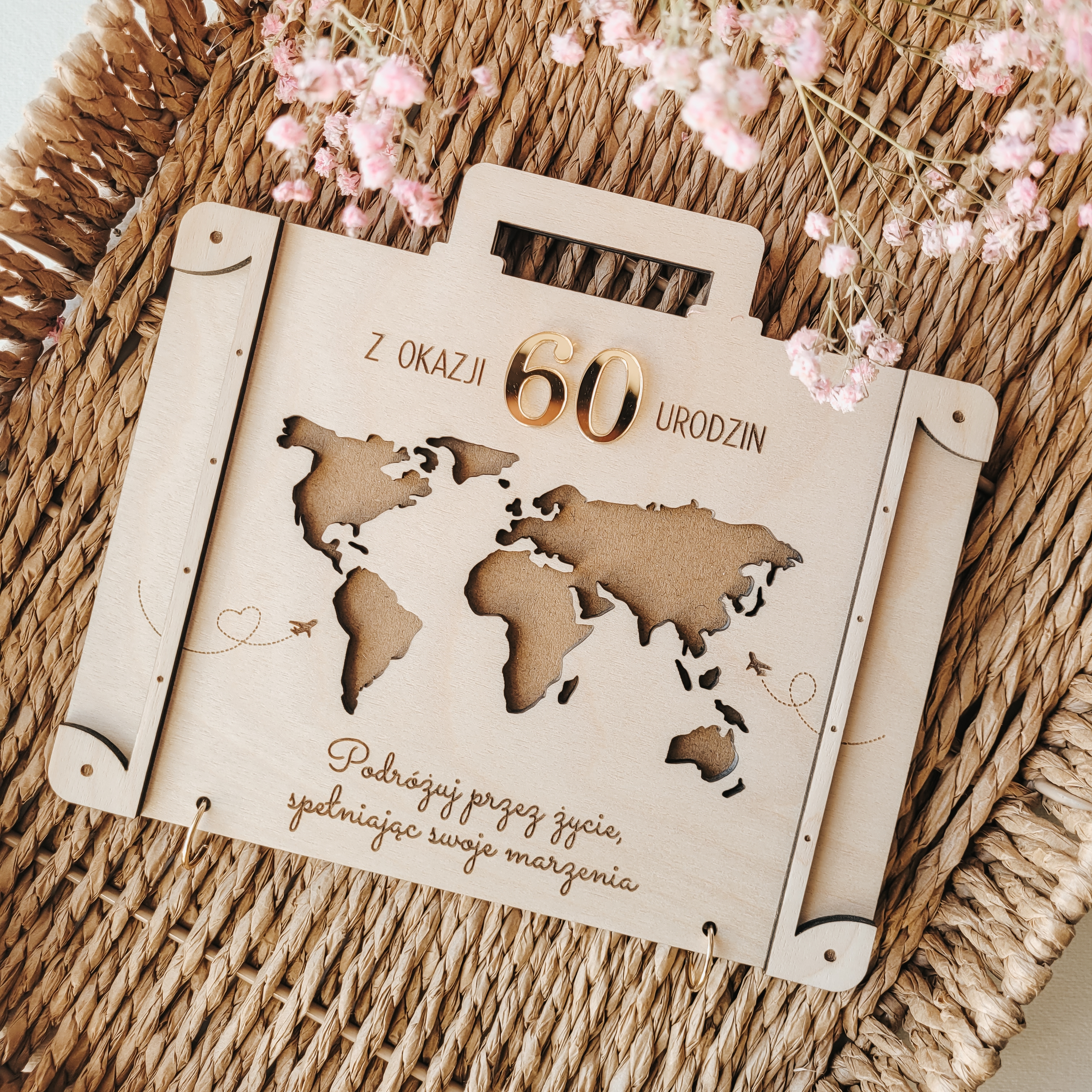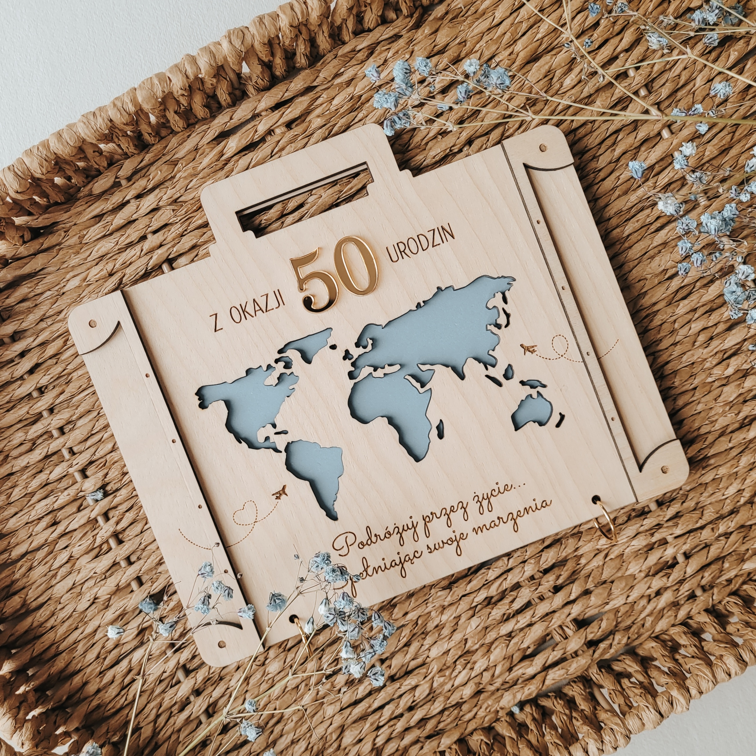 Prezent ma formę eleganckiej walizki wykonanej z naturalnego drewna, ozdobionej mapą świata, złotymi detalami oraz grawerowaną dedykacją.