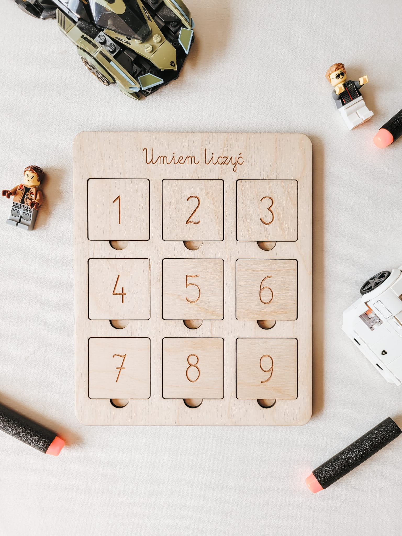 Zabawka składa się z planszy i dziewięciu kafelków z cyframi od 1 do 9.