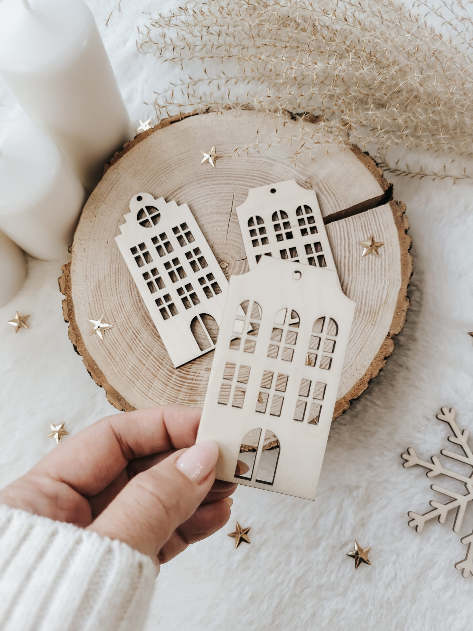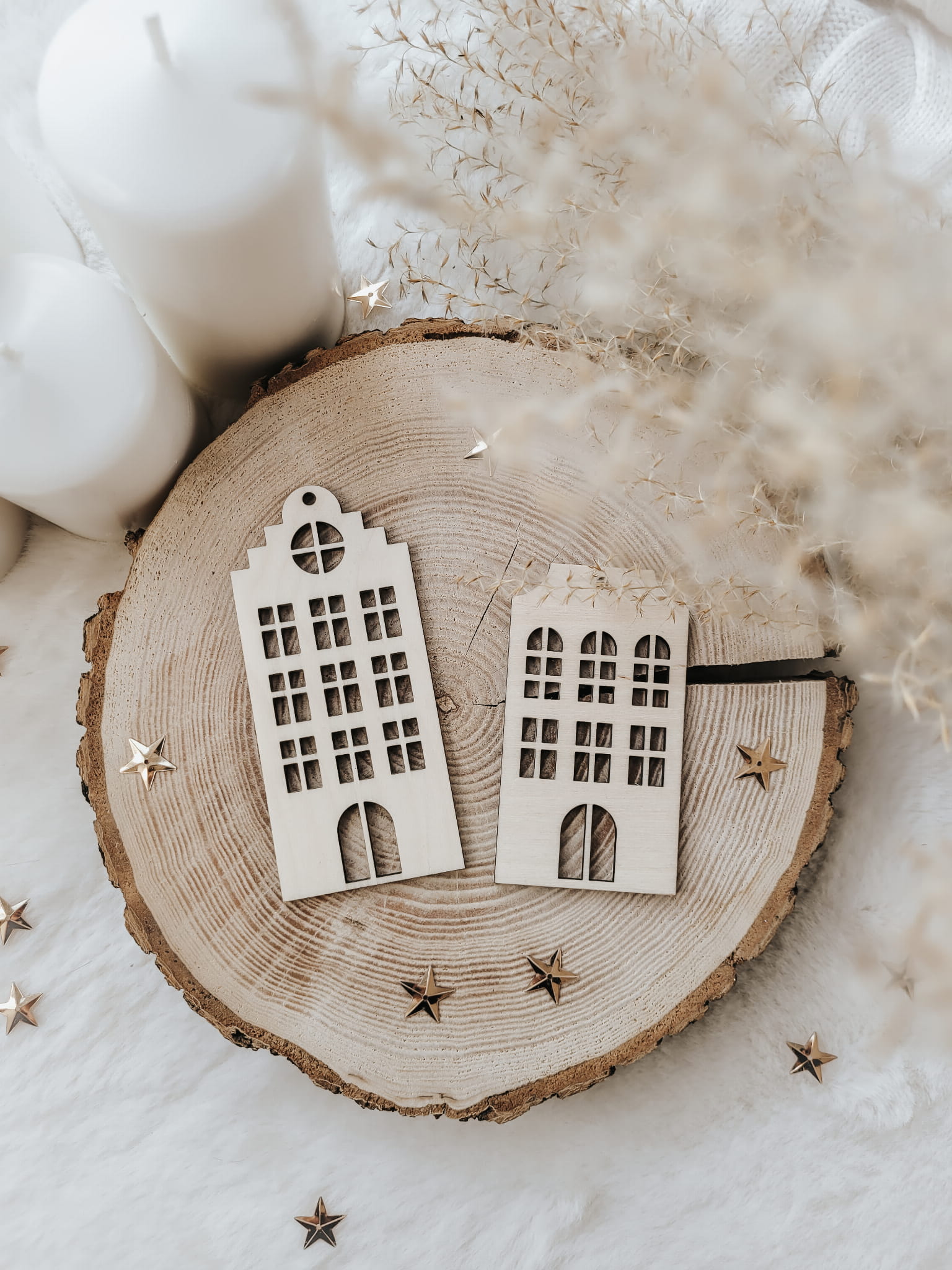 Komplet dwóch, uroczych drewnianych kamieniczek, do wykorzystania jako ozdoby na choinkę, zawieszki, itp.