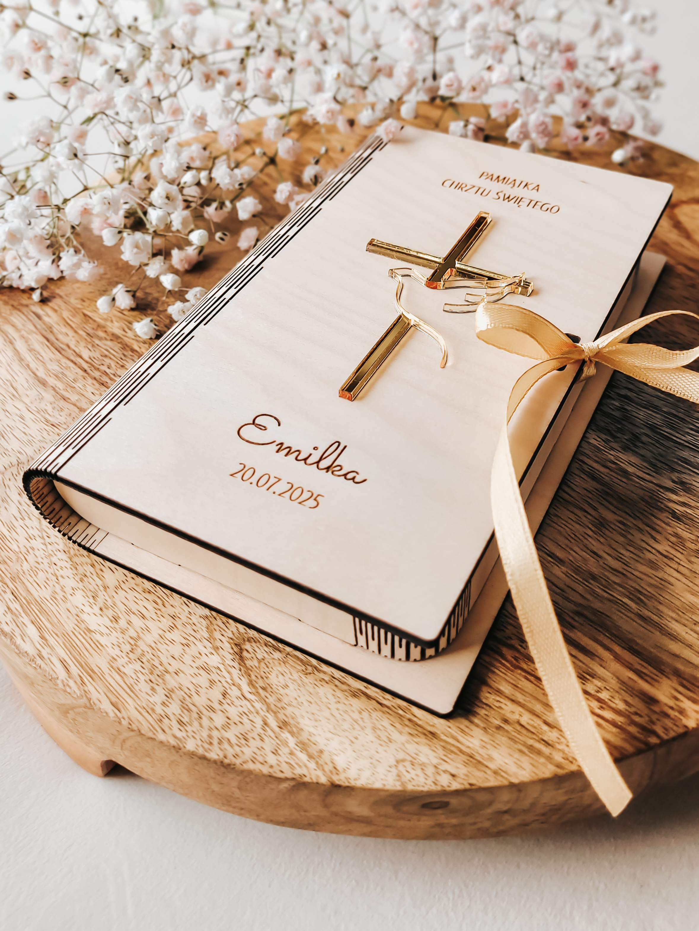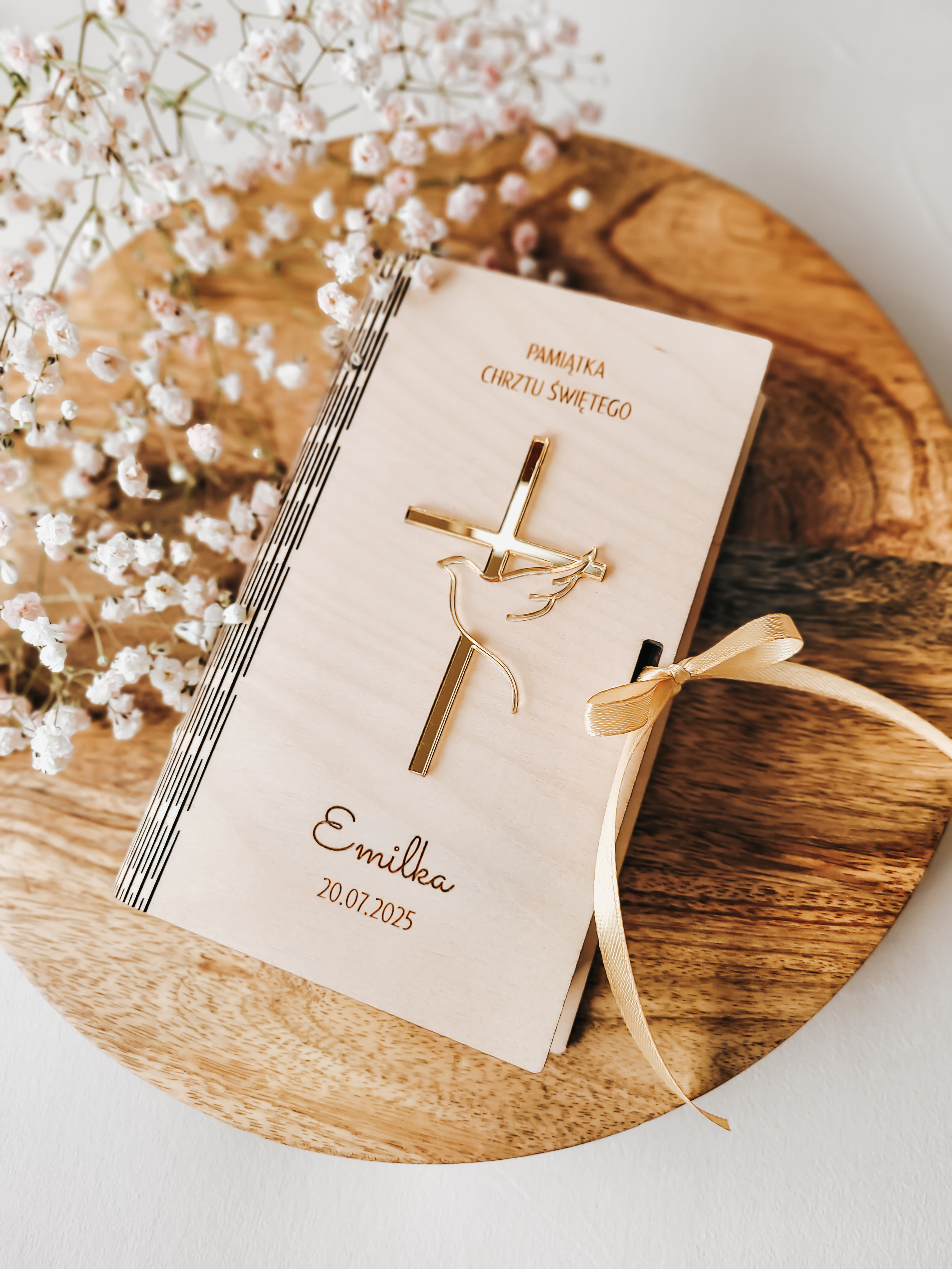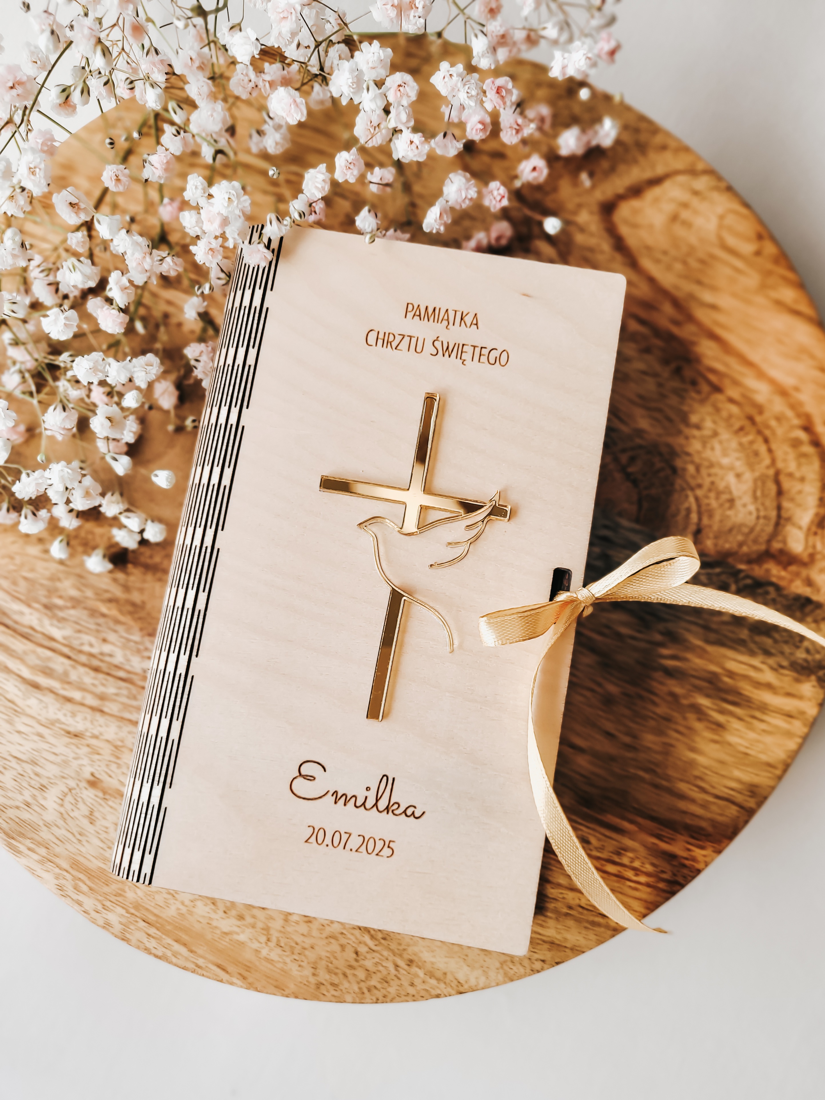 Na wieczku znajduje się grawerowany napis „Pamiątka Chrztu Świętego”, imię dziecka oraz data uroczystości, a także ozdobny motyw krzyża i gołębicy. Całość zdobi satynowa wstążka w kolorze złotym, dodająca elegancji i delikatności.
