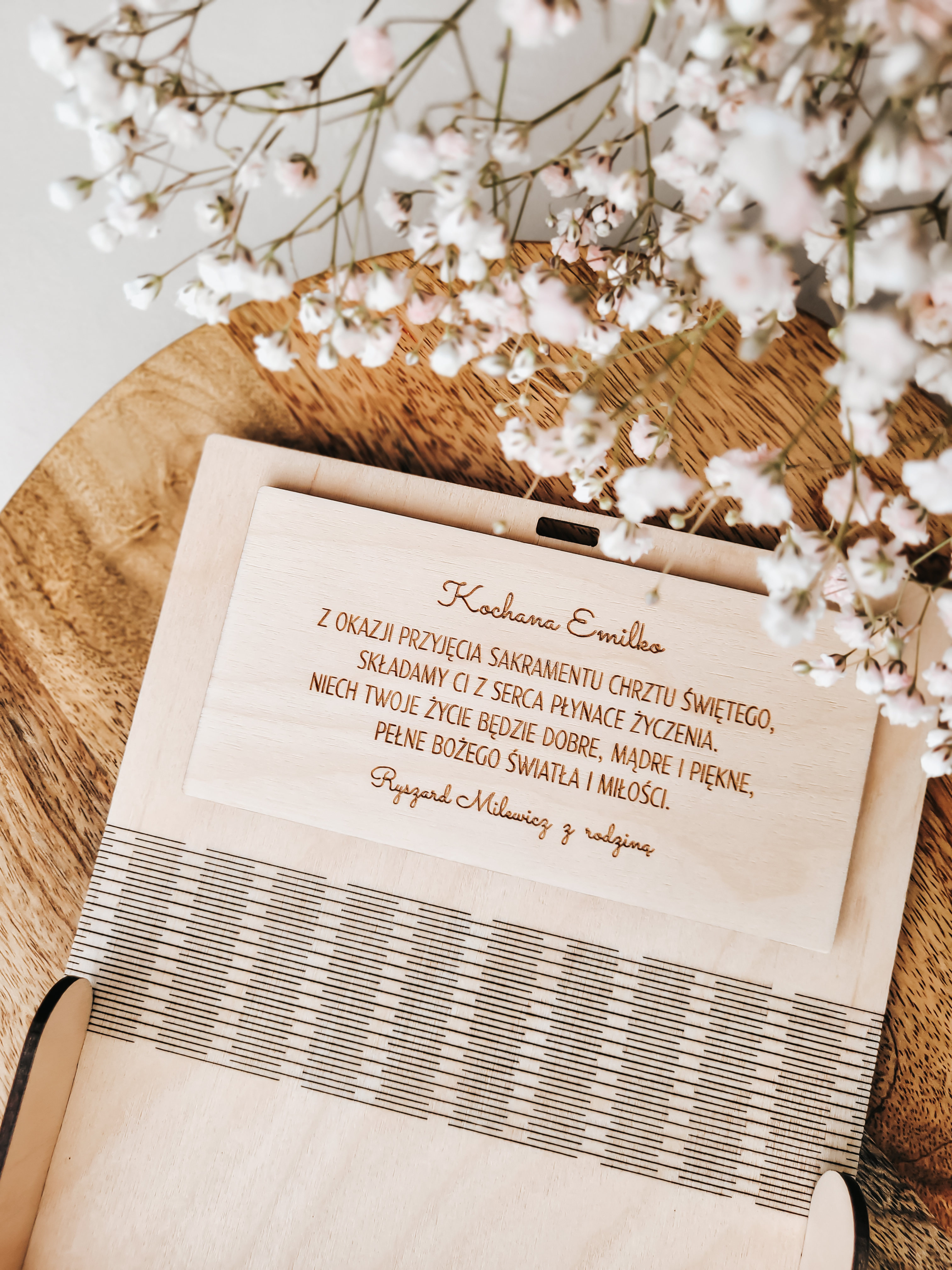 Wewnątrz pudełka umieszczony został spersonalizowany grawer z dedykacją – można wpisać własne życzenia oraz podpis, dzięki czemu prezent nabierze osobistego charakteru.
