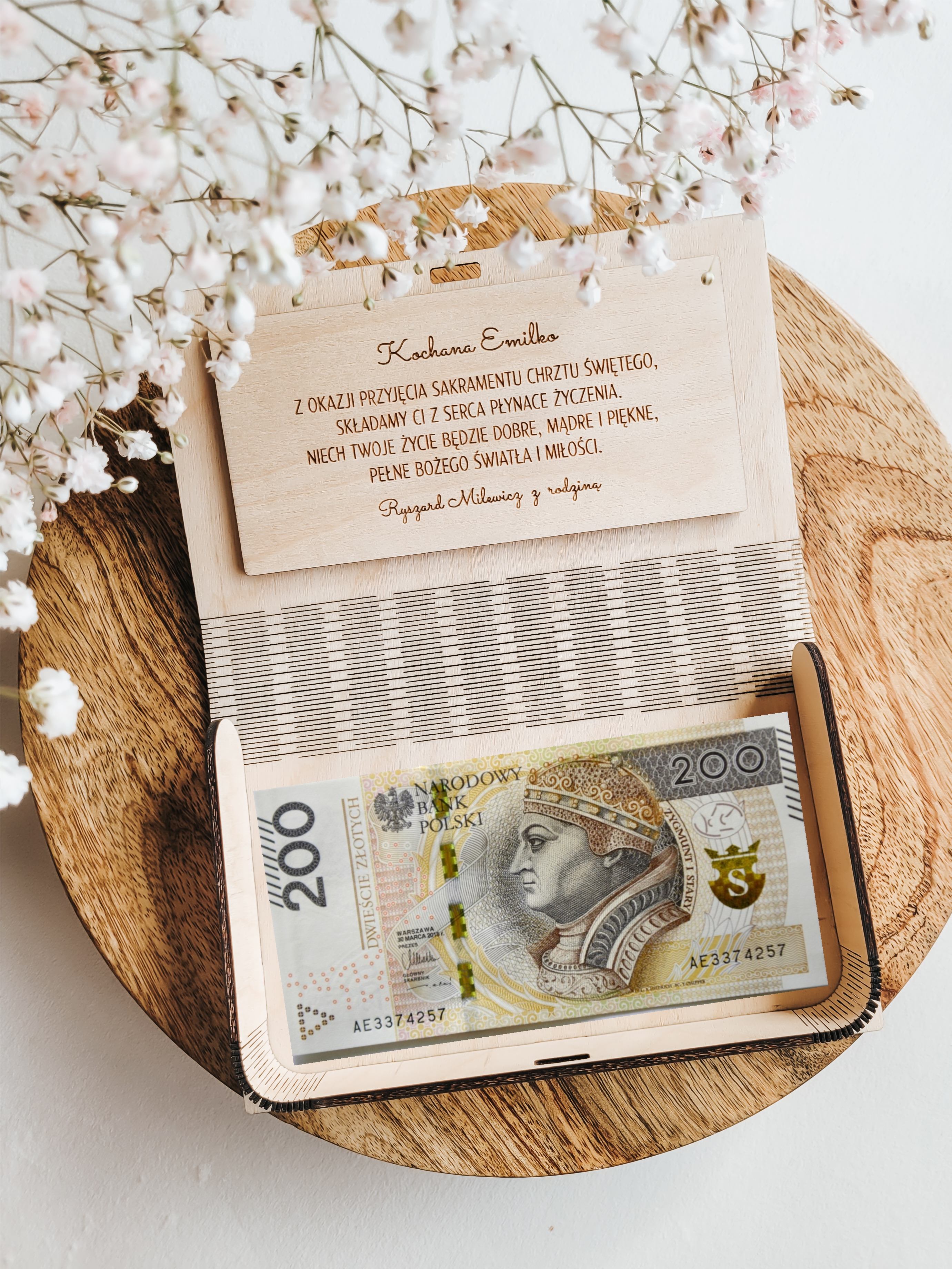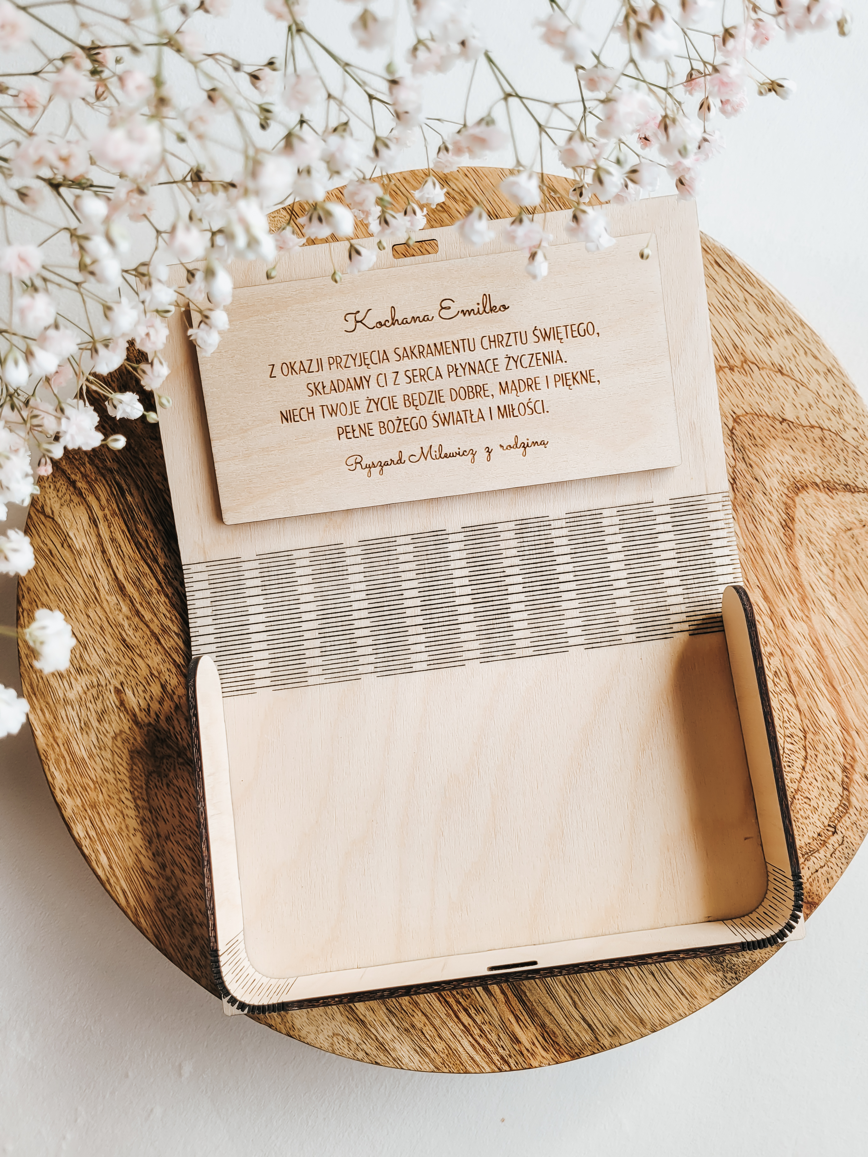 Personalizowane, ręcznie wykonane drewniane pudełko na pamiątkę Chrztu Świętego. Idealne na drobne upominki, biżuterię, różaniec, banknoty lub inne symboliczne przedmioty związane z tym ważnym dniem.
