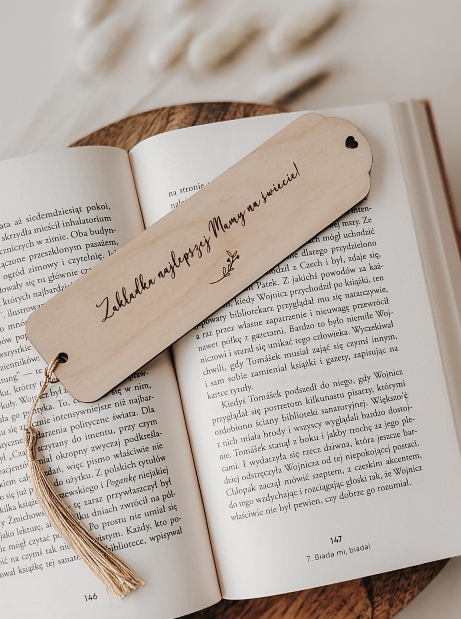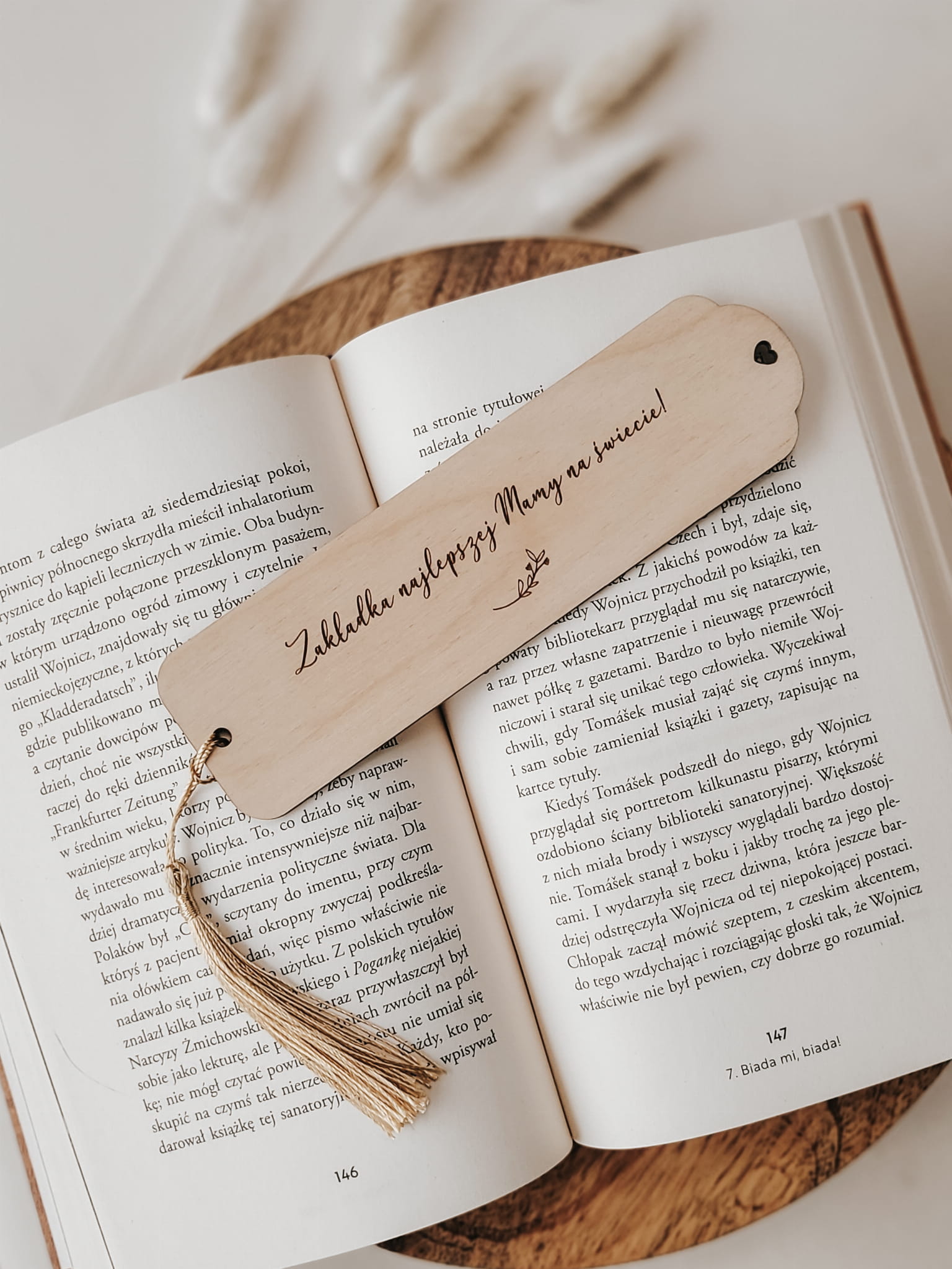 Drewniana zakładka do książki z grawerowanym napisem.