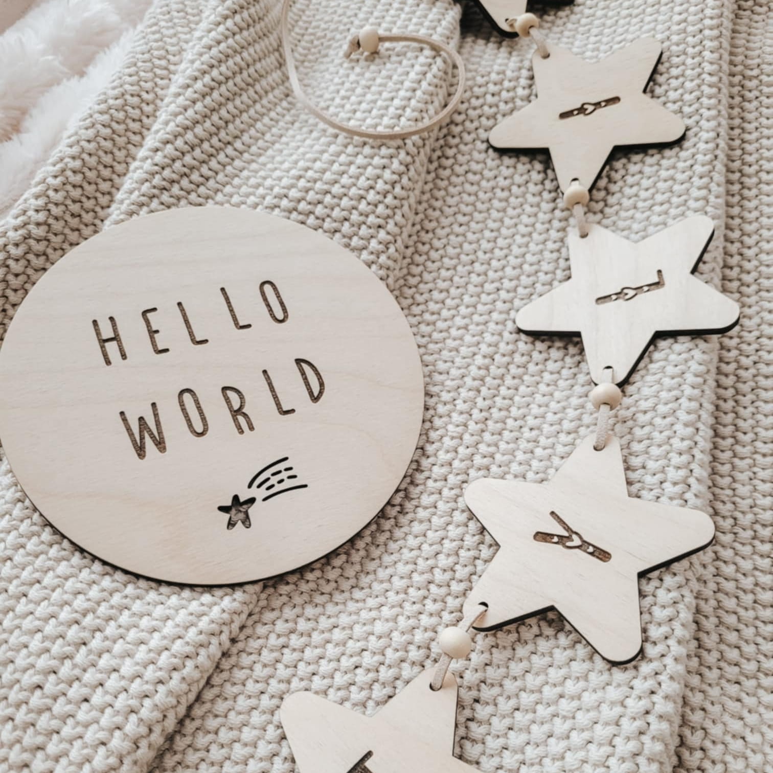 Drewniana plakietka HELLO WORLD z ażurową gwiazdką, do uwiecznienia pierwszych chwil życia malucha.