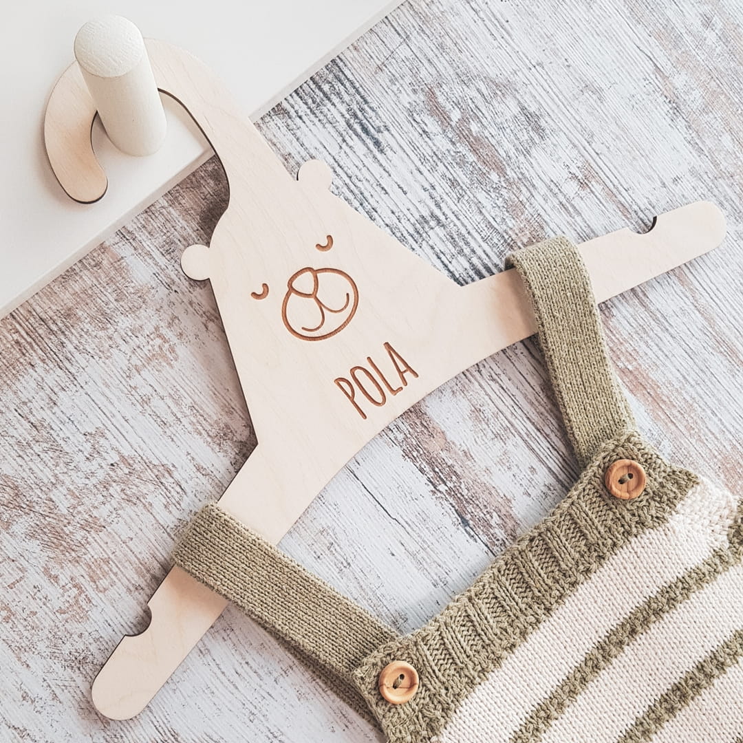 Słodki, drewniany wieszaczek w kształcie misia, personalizowany imieniem dziecka lub innym napisem.