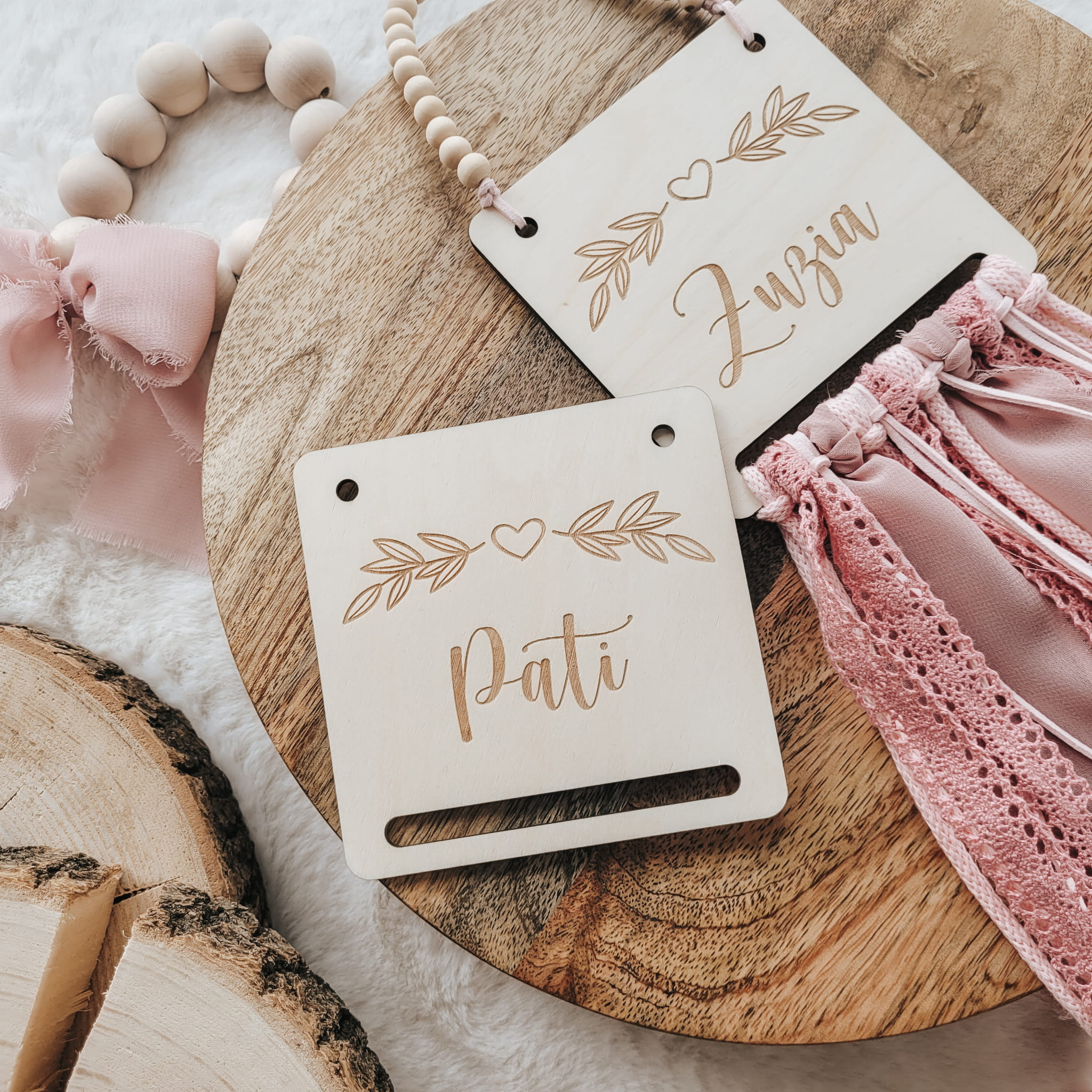 Drewniana zawieszka z grawerowanym imieniem, do ozdobienia makramą, wstążeczkami czy suszonymi kwiatami.