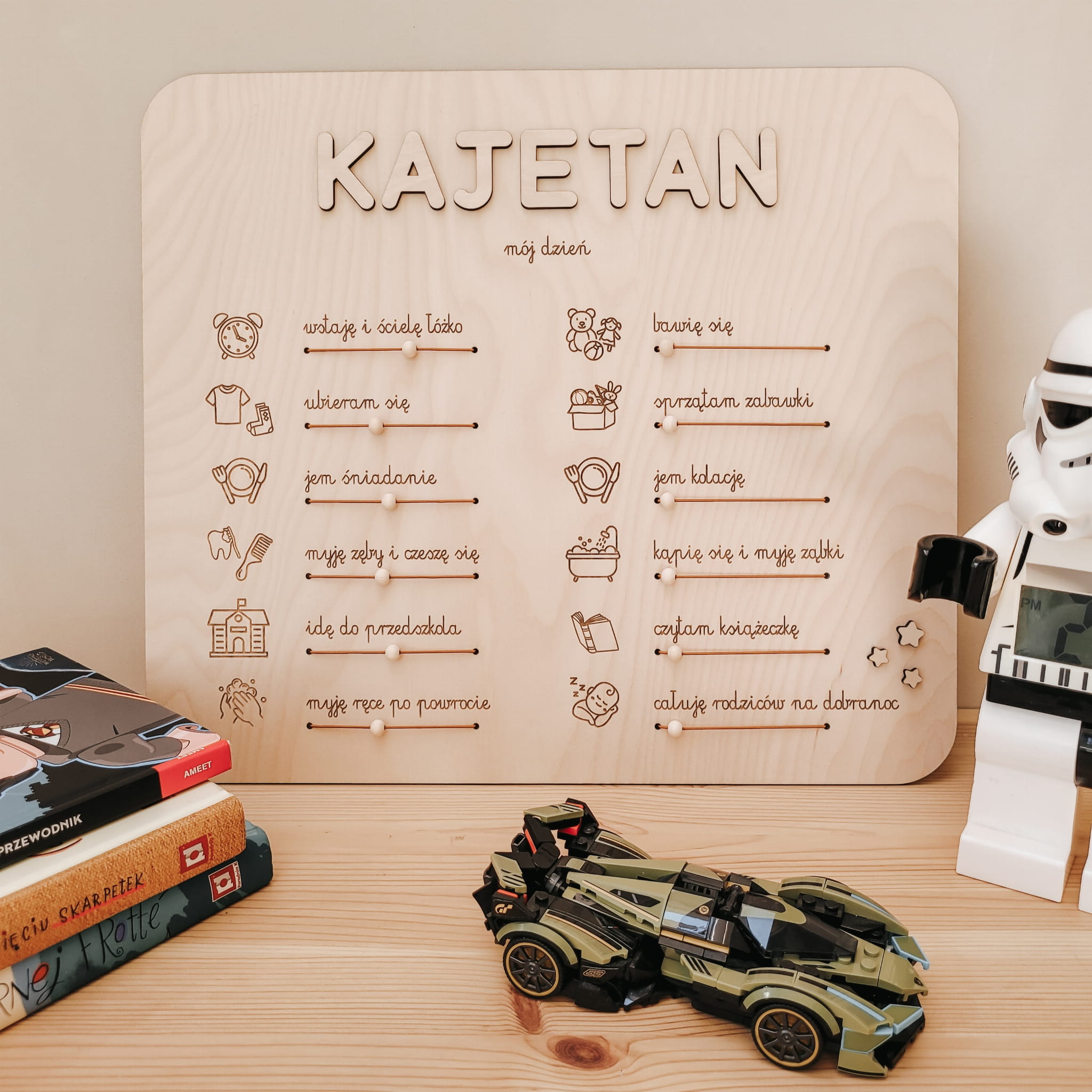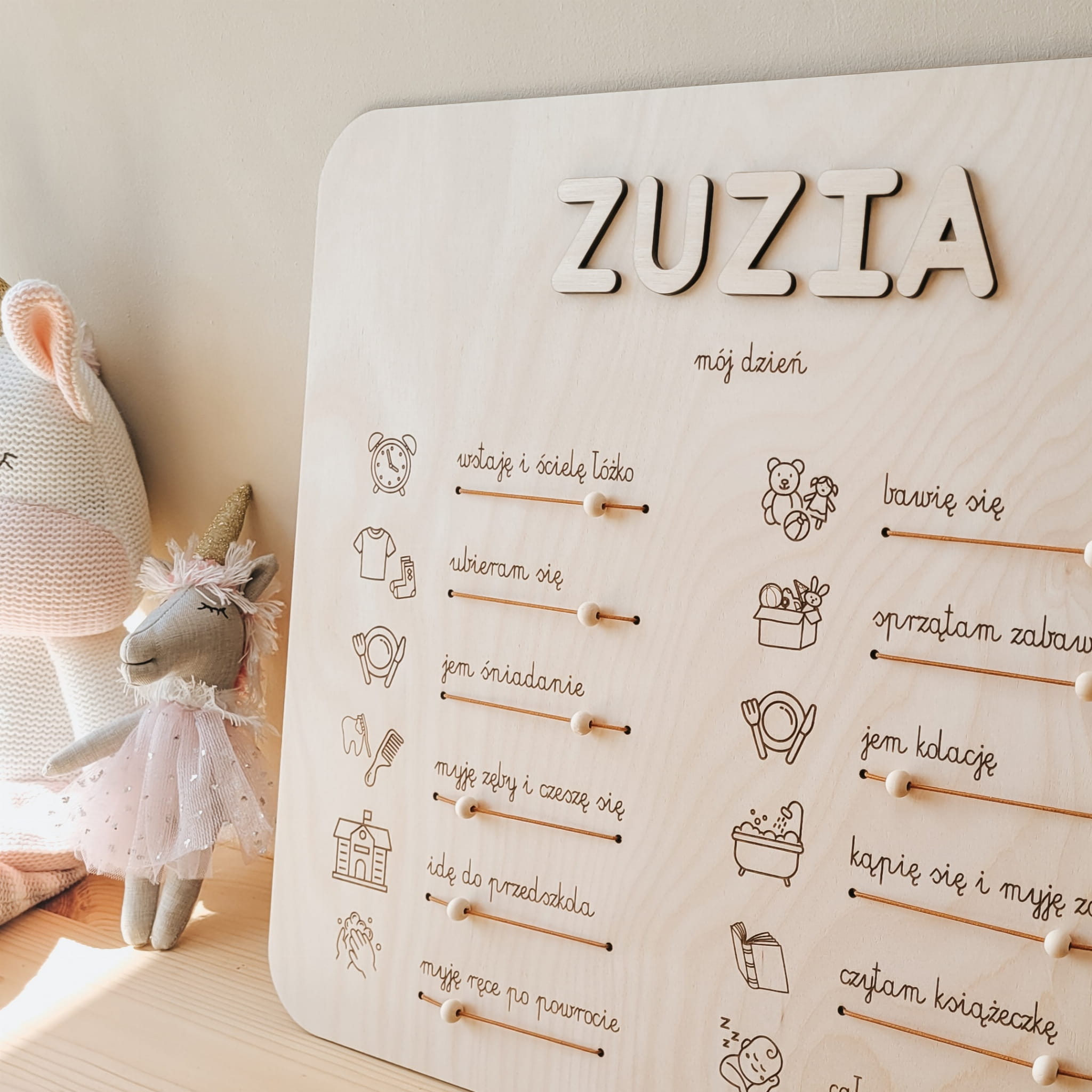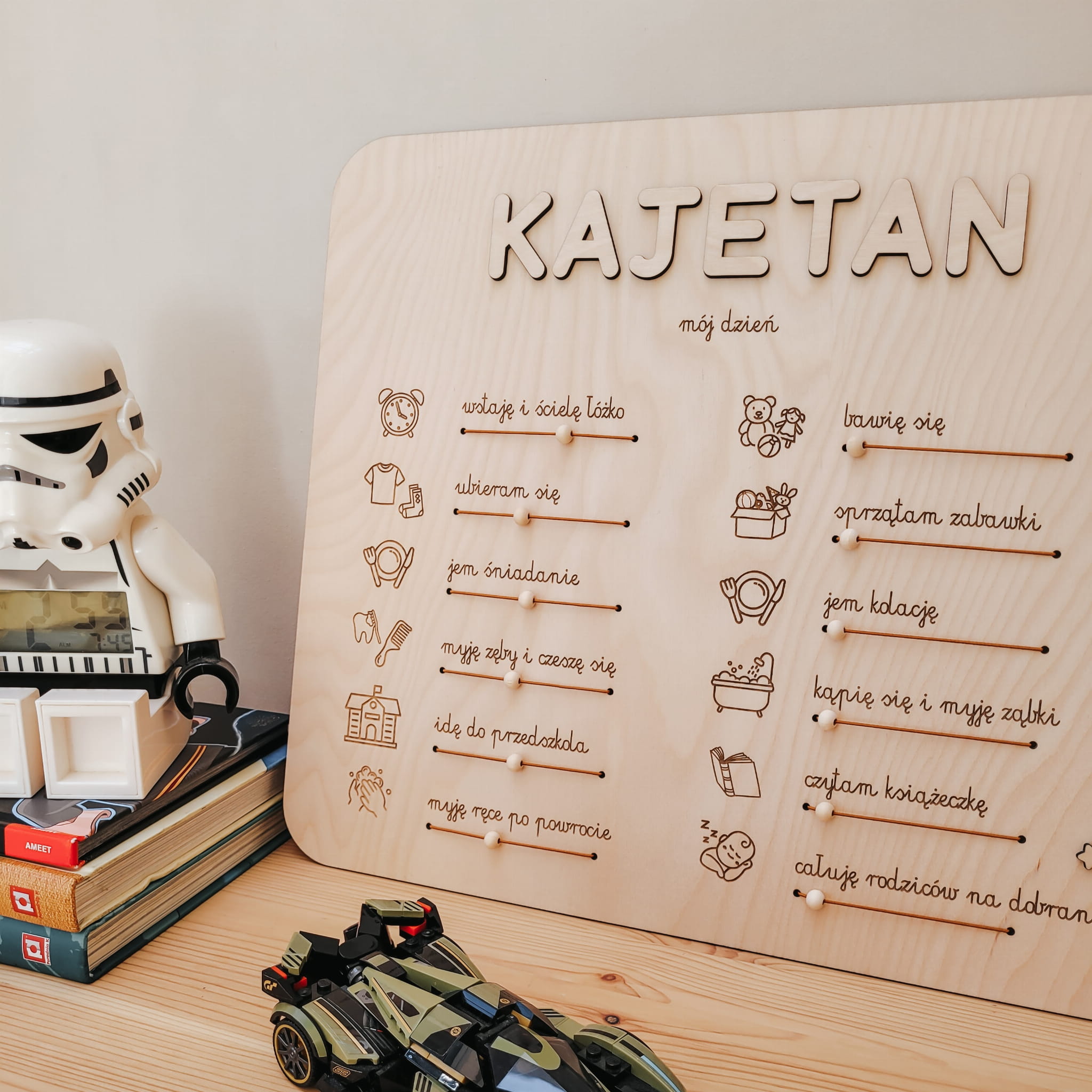 Drewniany planer z dowolnym imieniem w formie praktycznej tablicy z zadaniami, które dziecko wykonuje każdego dnia – od porannego wstawania, przez zabawę i posiłki, aż po wieczorne rytuały.
