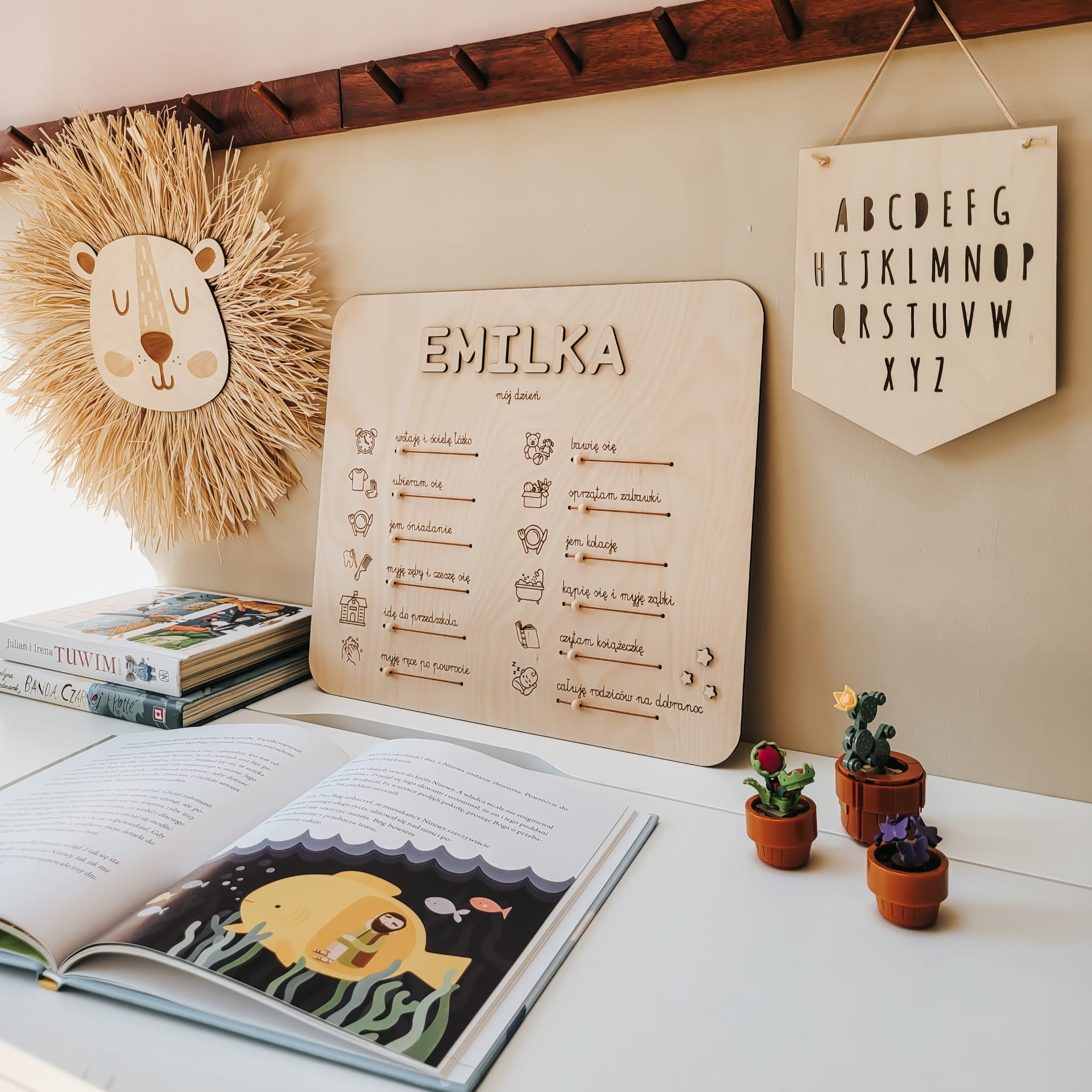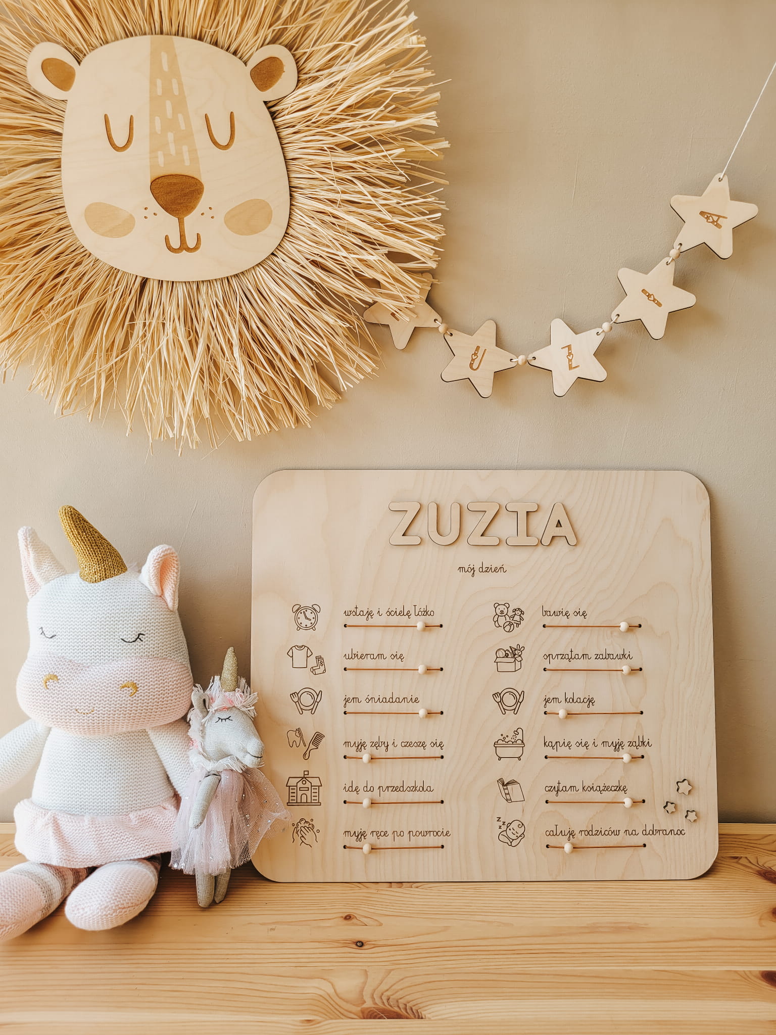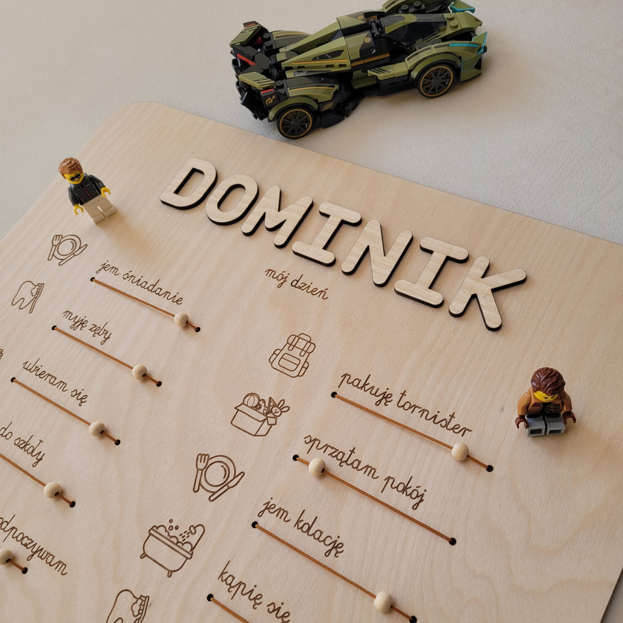 Drewniany planer z dowolnym imieniem w formie praktycznej tablicy z zadaniami, które dziecko wykonuje każdego dnia – od porannego wstawania, przez zabawę i posiłki, aż po wieczorne rytuały.
