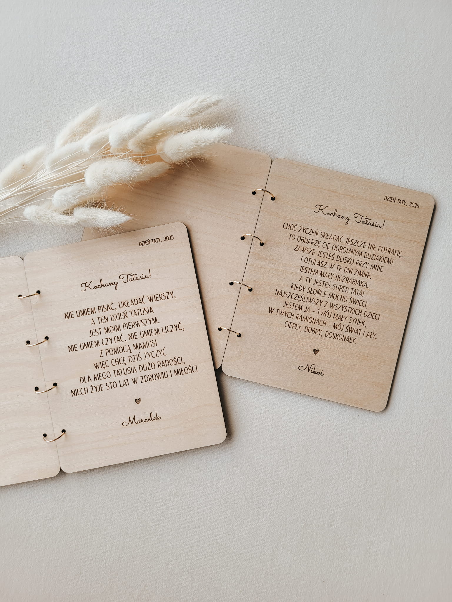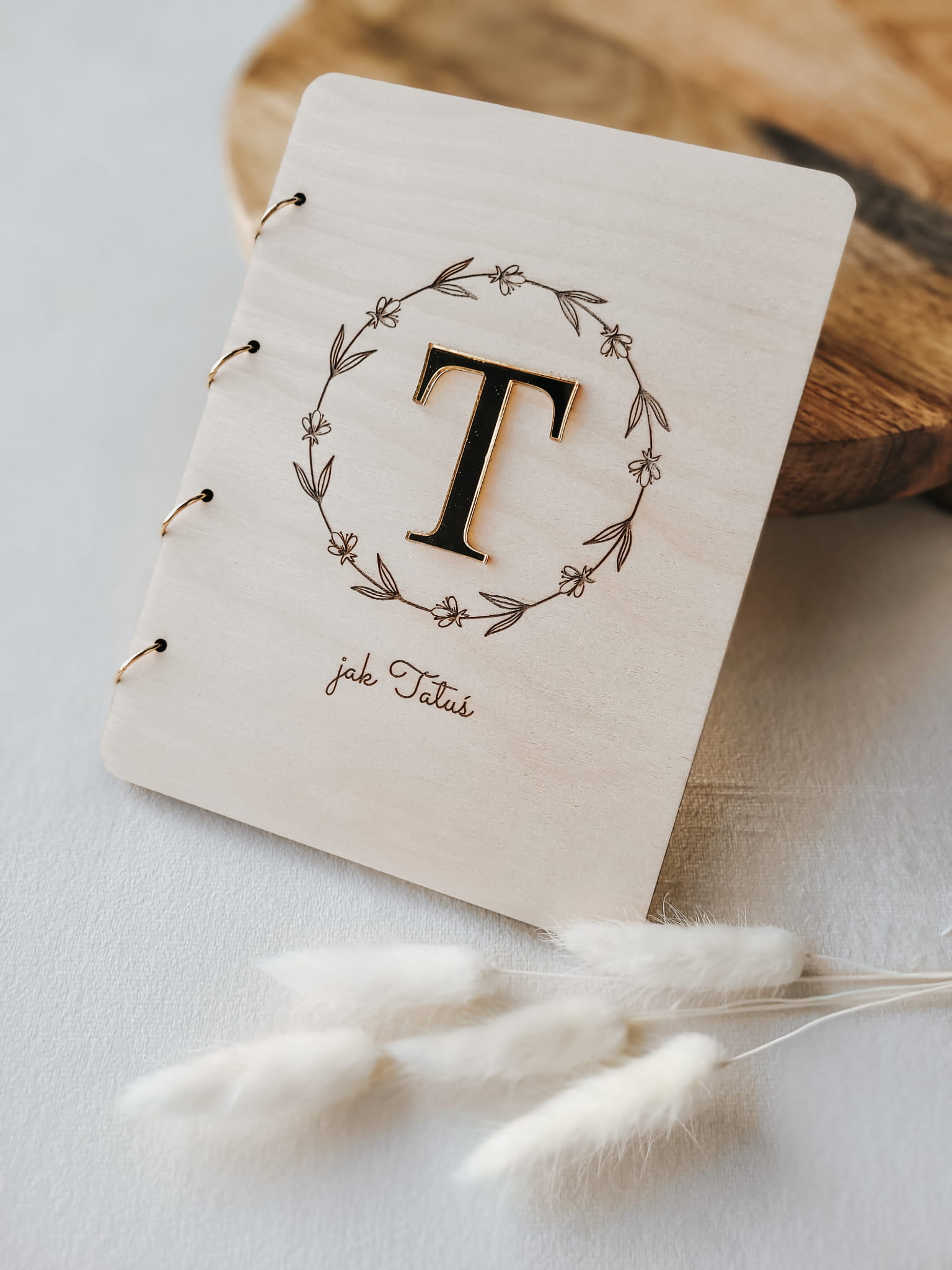 Drewniana kartka okolicznościowa w formie otwieranej książeczki na Dzień Taty, z elegancką złotą literką T na okładce.