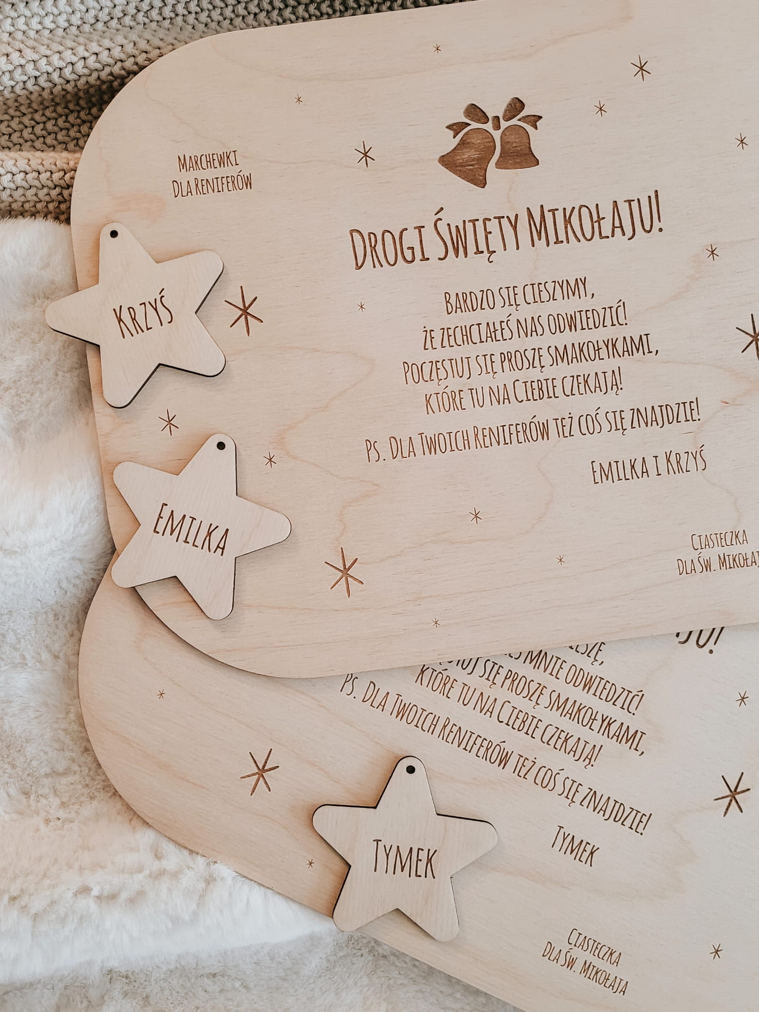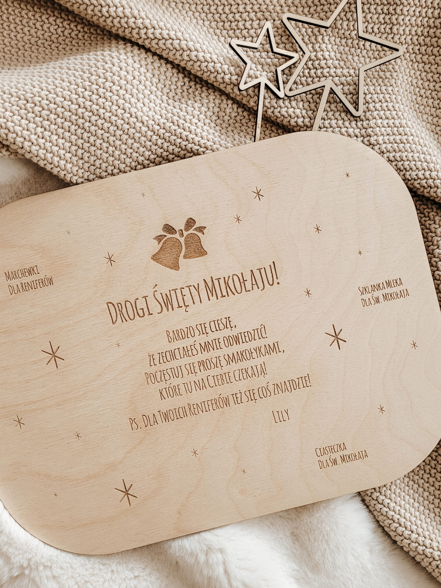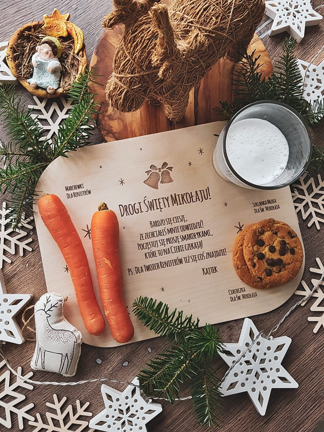 Personalizowana, drewniana taca z listem do Św. Mikołaja, na której położysz smakołyki dla Świętego i jego reniferów.