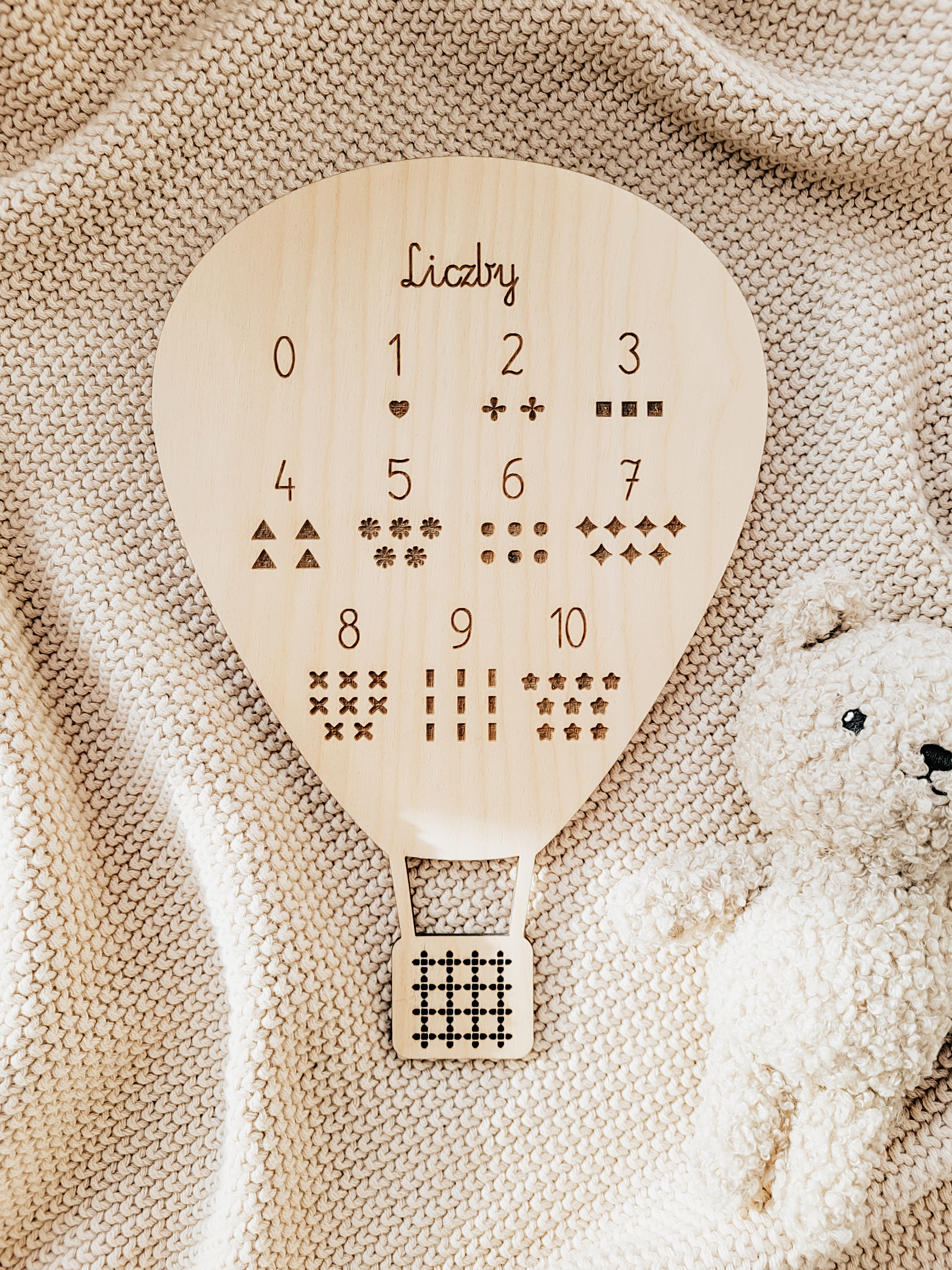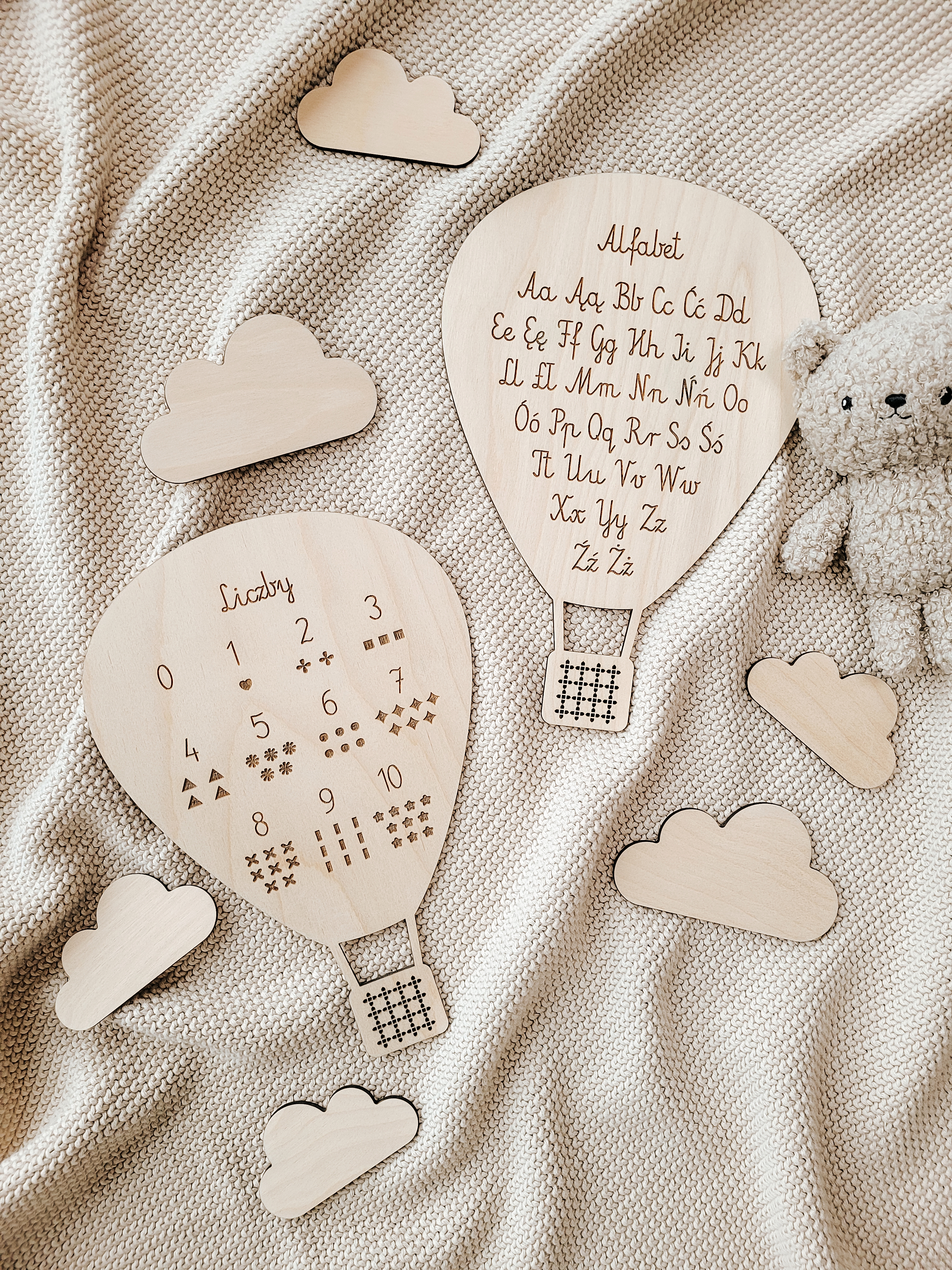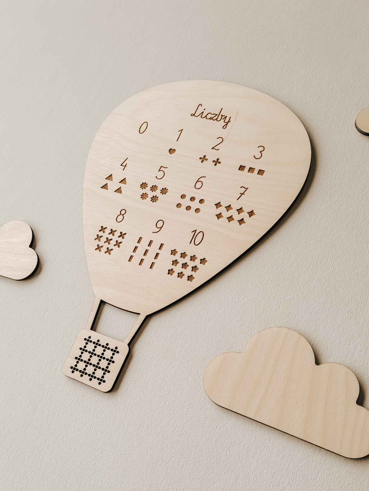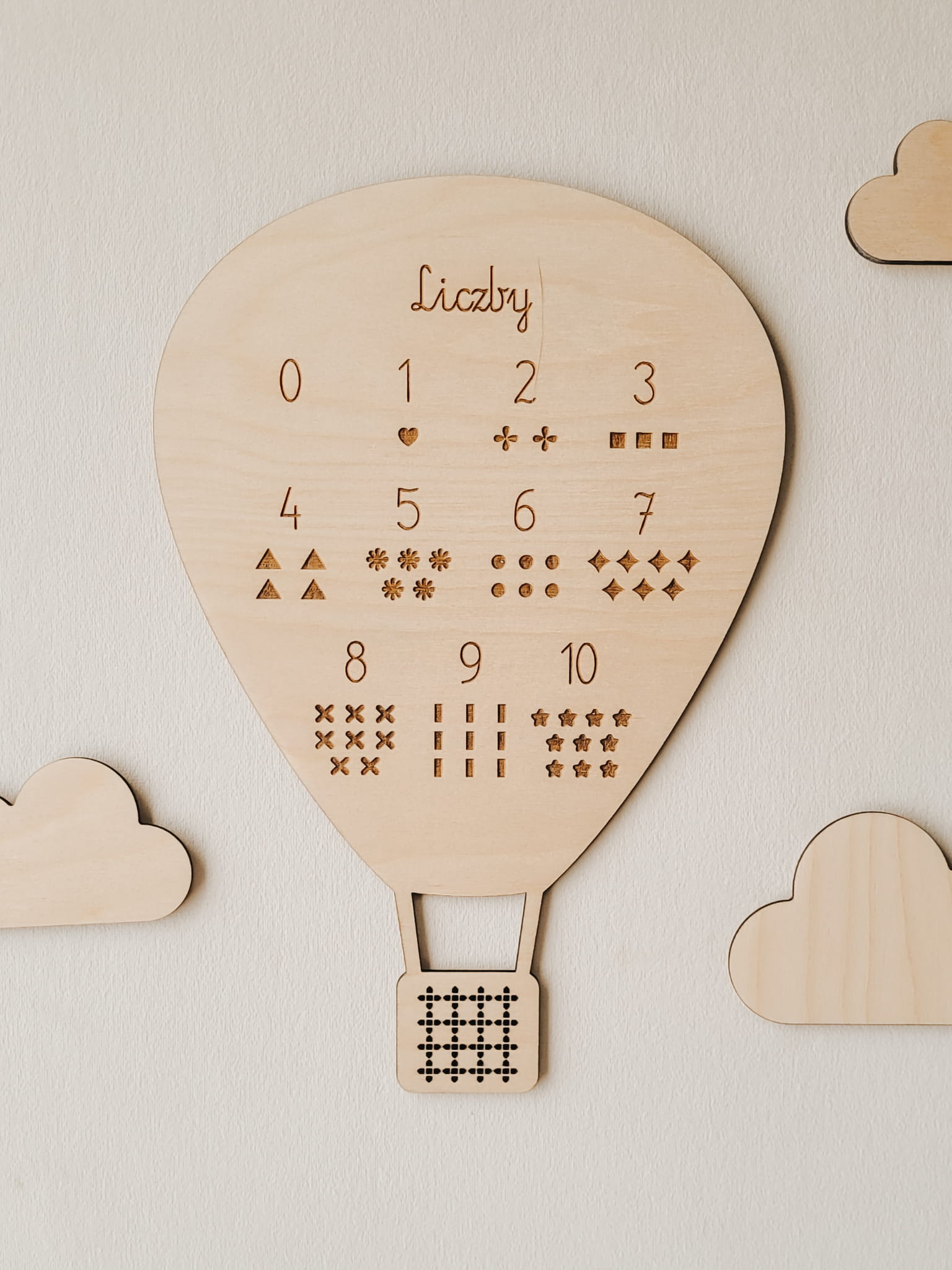 Drewniana tabliczka w kształcie balona z trzema uroczymi chmurkami dla przedszkolaka, zerówkowicza lub ucznia edukacji wczesnoszkolnej do wspierania dzieci w nauce liczb od 0 do 10.
