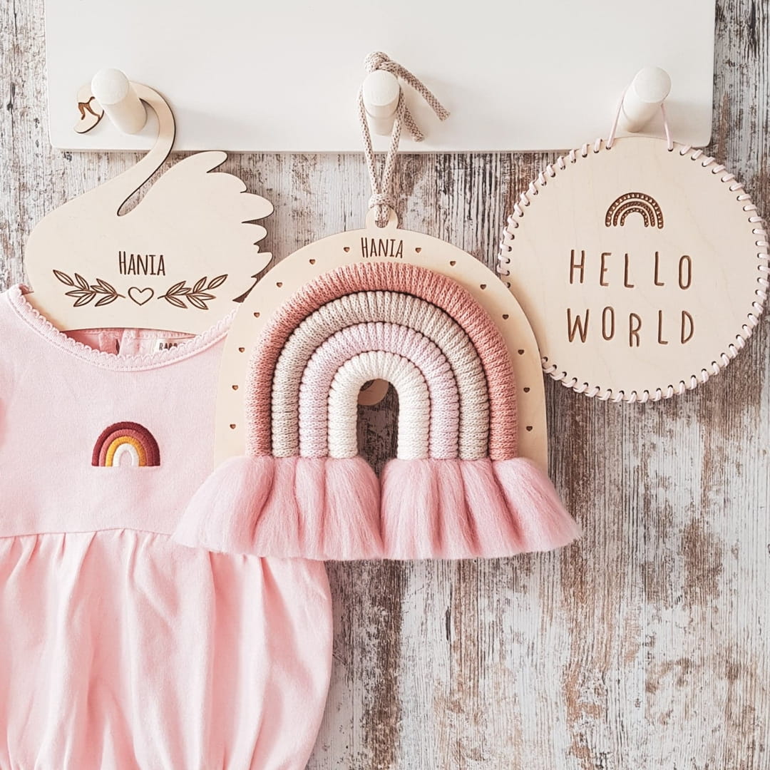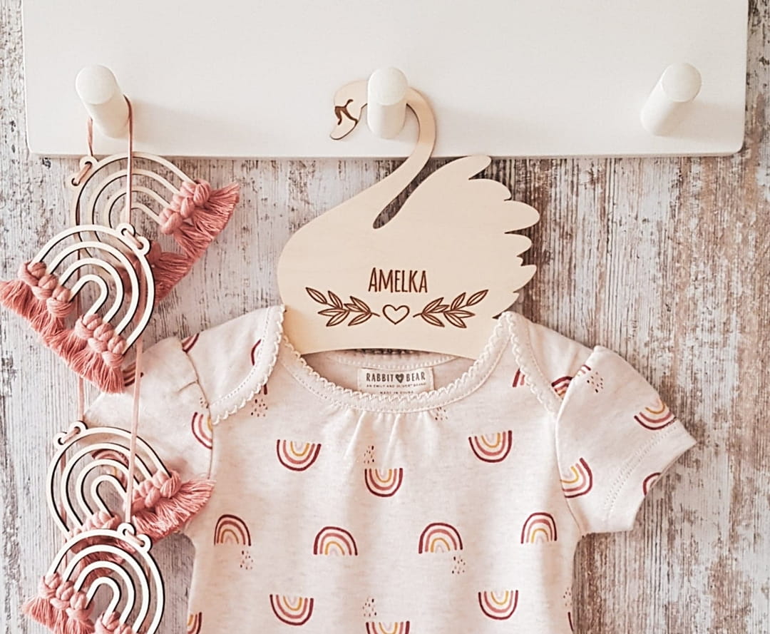 Drewniany, dziewczęcy wieszaczek w kształcie łabędzia, personalizowany imieniem dziecka lub innym (krótkim) napisem.
