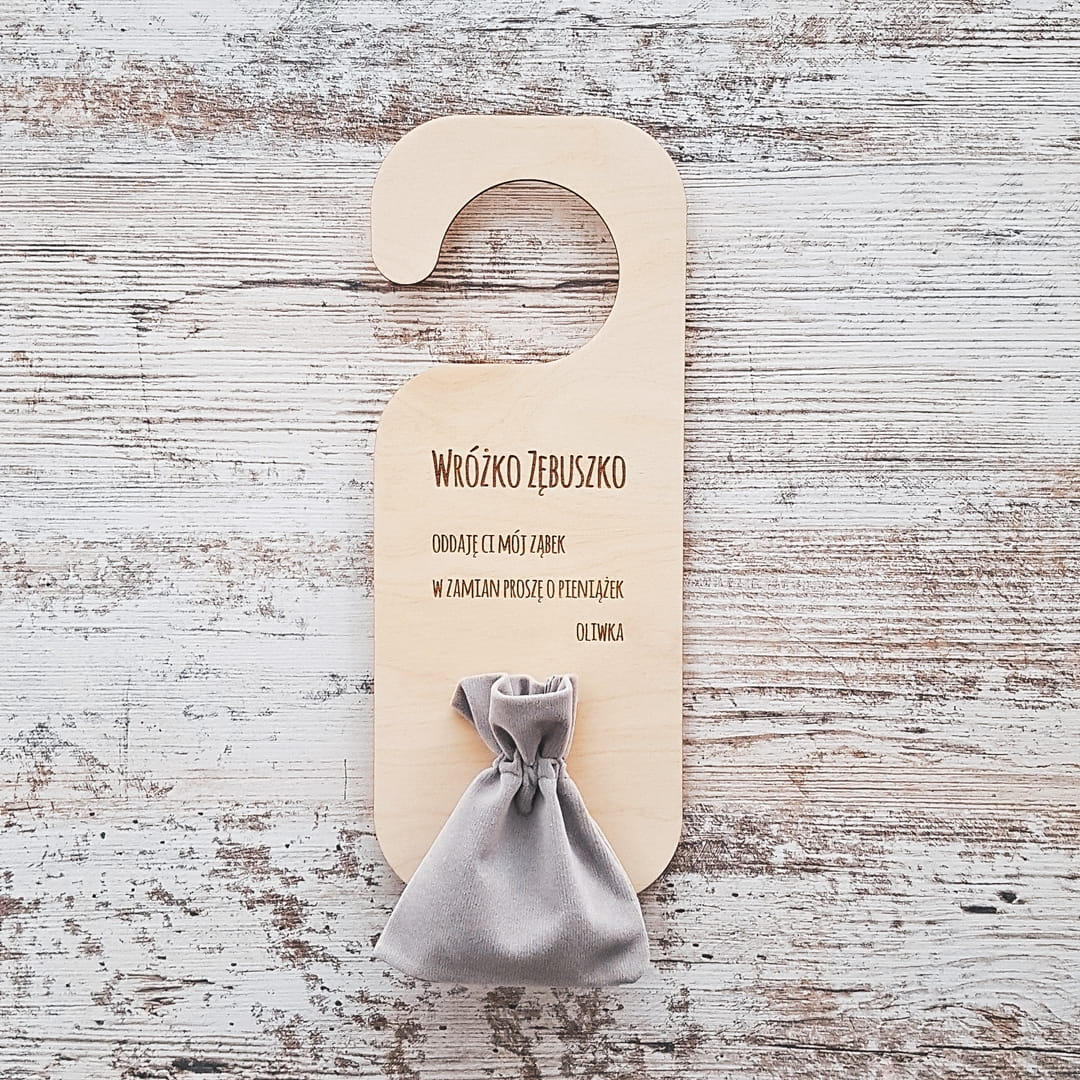 Personalizowana, drewniana zawieszka - list do Wróżki Zębuszki z prośbą o pieniążek, w zamian za pozostawiony na noc w woreczku mleczny ząbek dziecka.