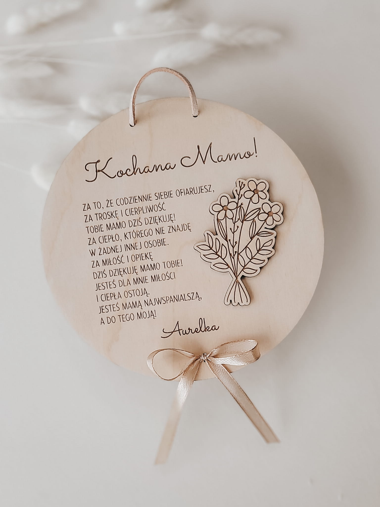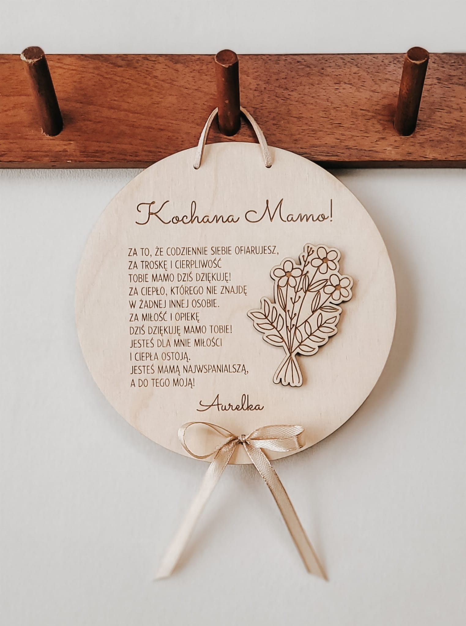 Urocza zawieszka z wierszowanym podziękowaniem dla mamy, ozdobiona drewnianym bukiecikiem i kokardką.