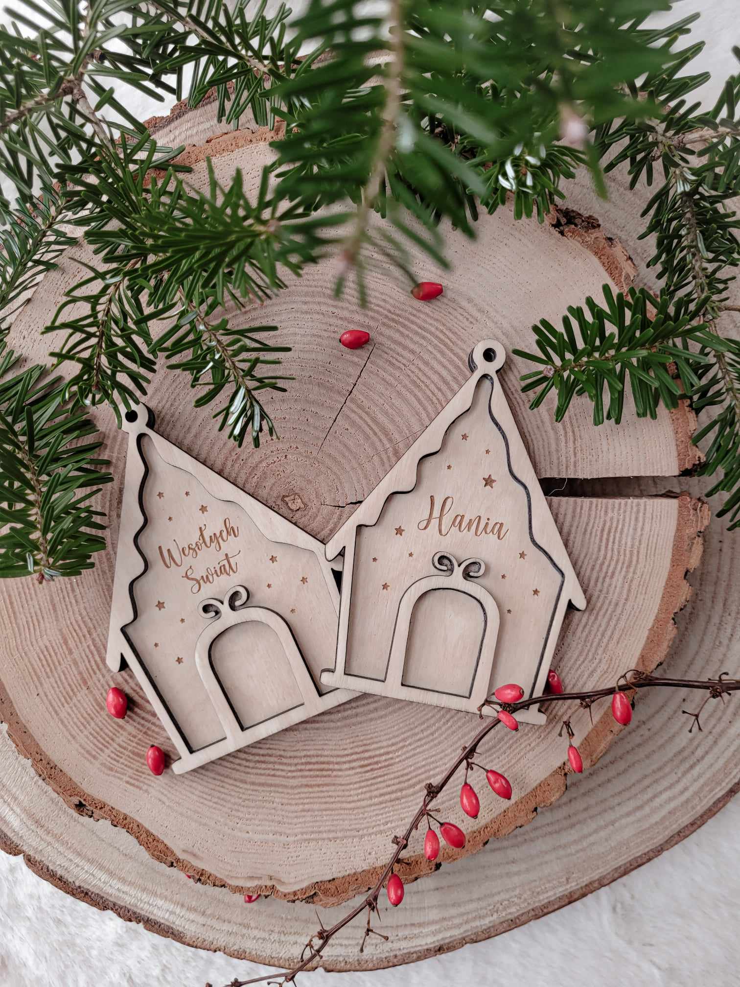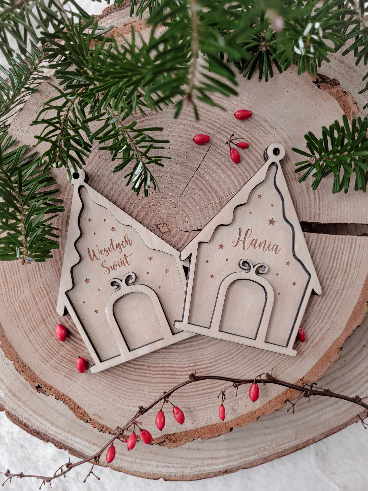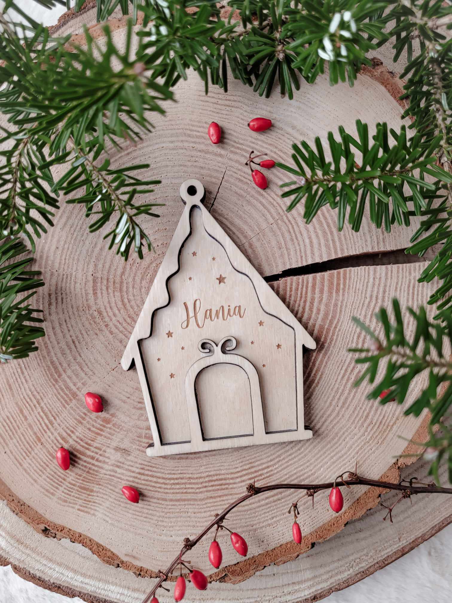 Wyjątkowa zawieszka na choinkę z imieniem lub krótkim napisem, wykonana z wysokiej jakości sklejki drewnianej, w formie słodkiej chatki z piernika.