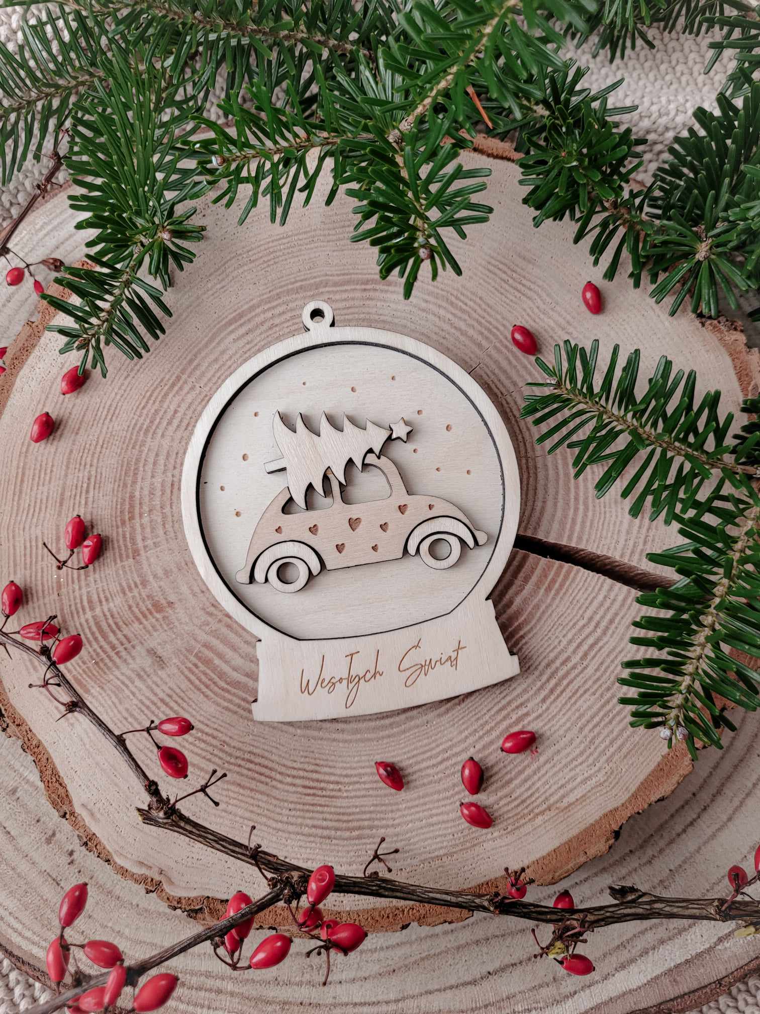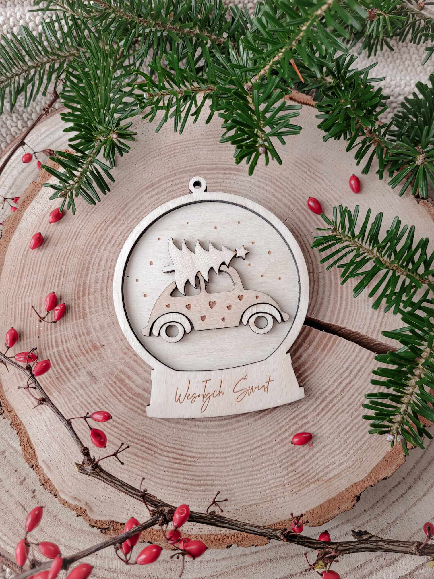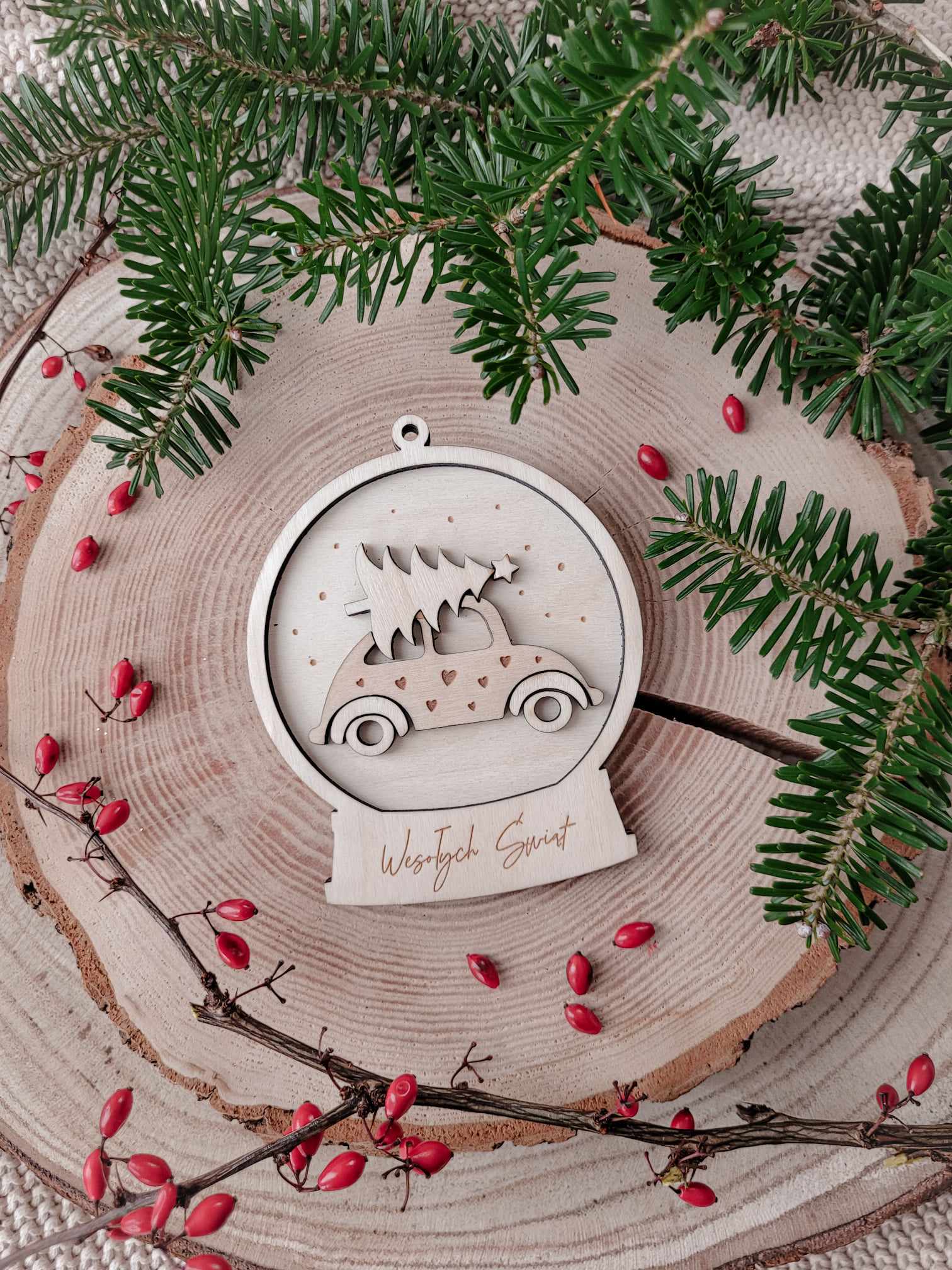 Wyjątkowa zawieszka na choinkę z dowolnym napisem, wykonana z wysokiej jakości sklejki, w formie kuli śnieżnej z autkiem wiozącym choinkę.