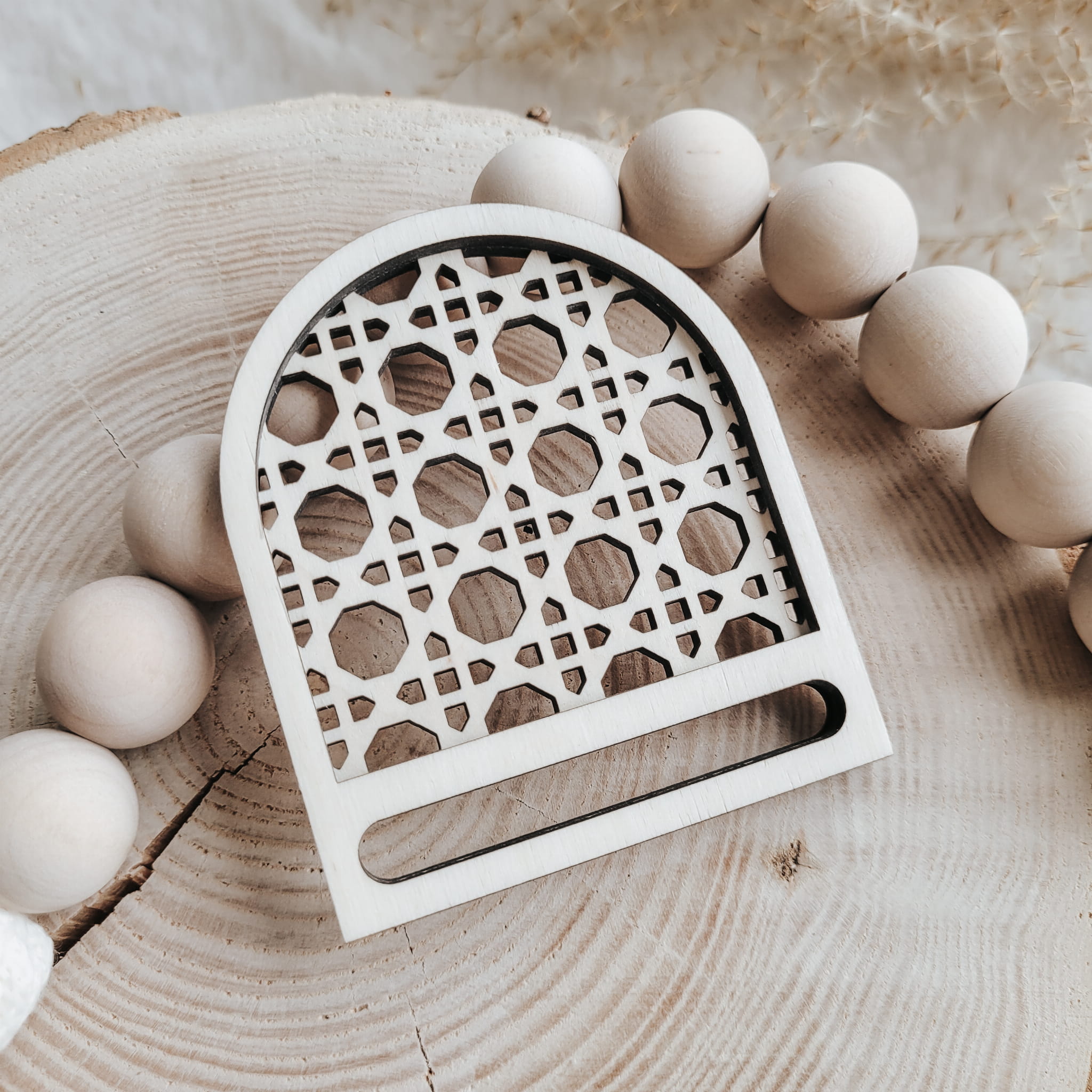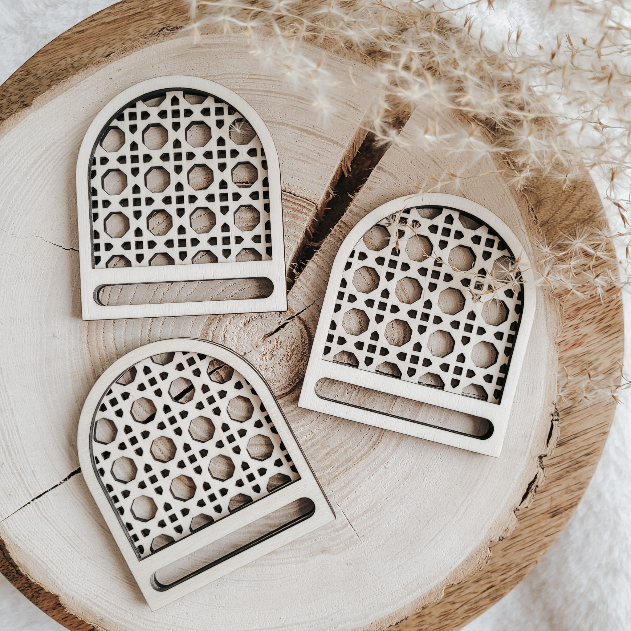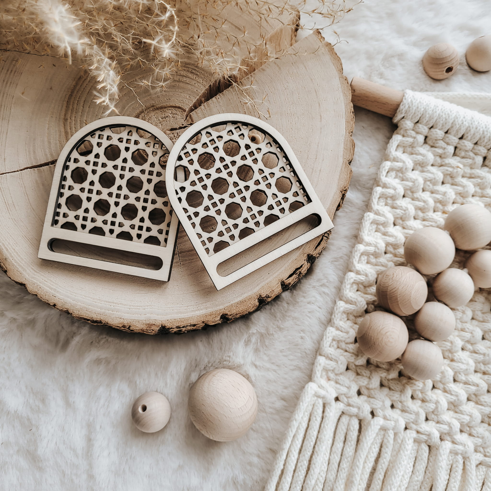 Drewniana ażurowa zawieszka do ozdobienia makramą lub wstążkami.