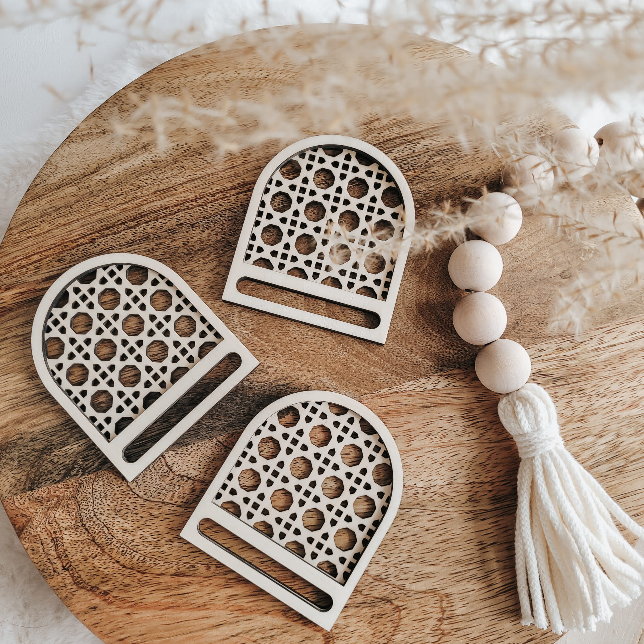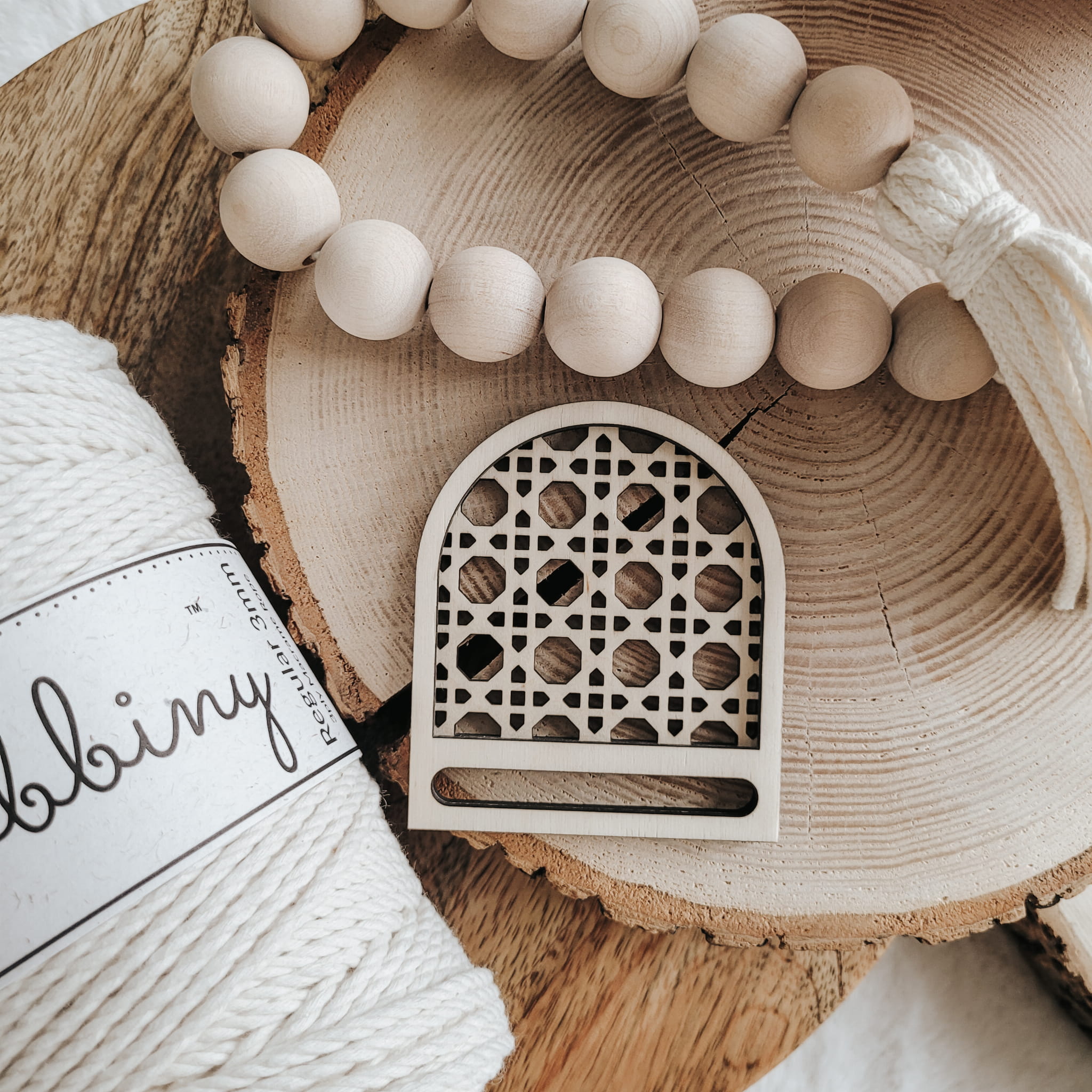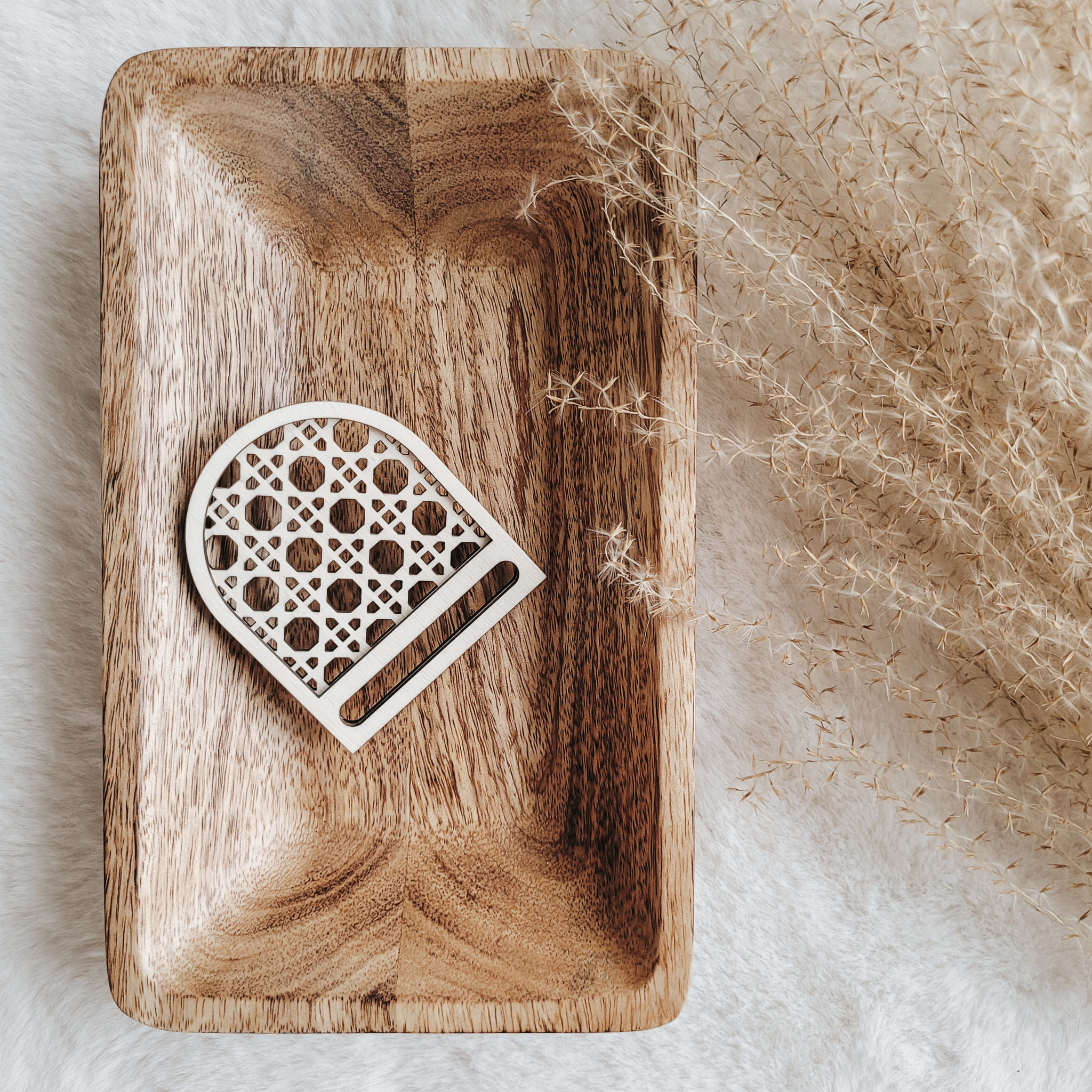Drewniana ażurowa zawieszka do ozdobienia makramą lub wstążkami.