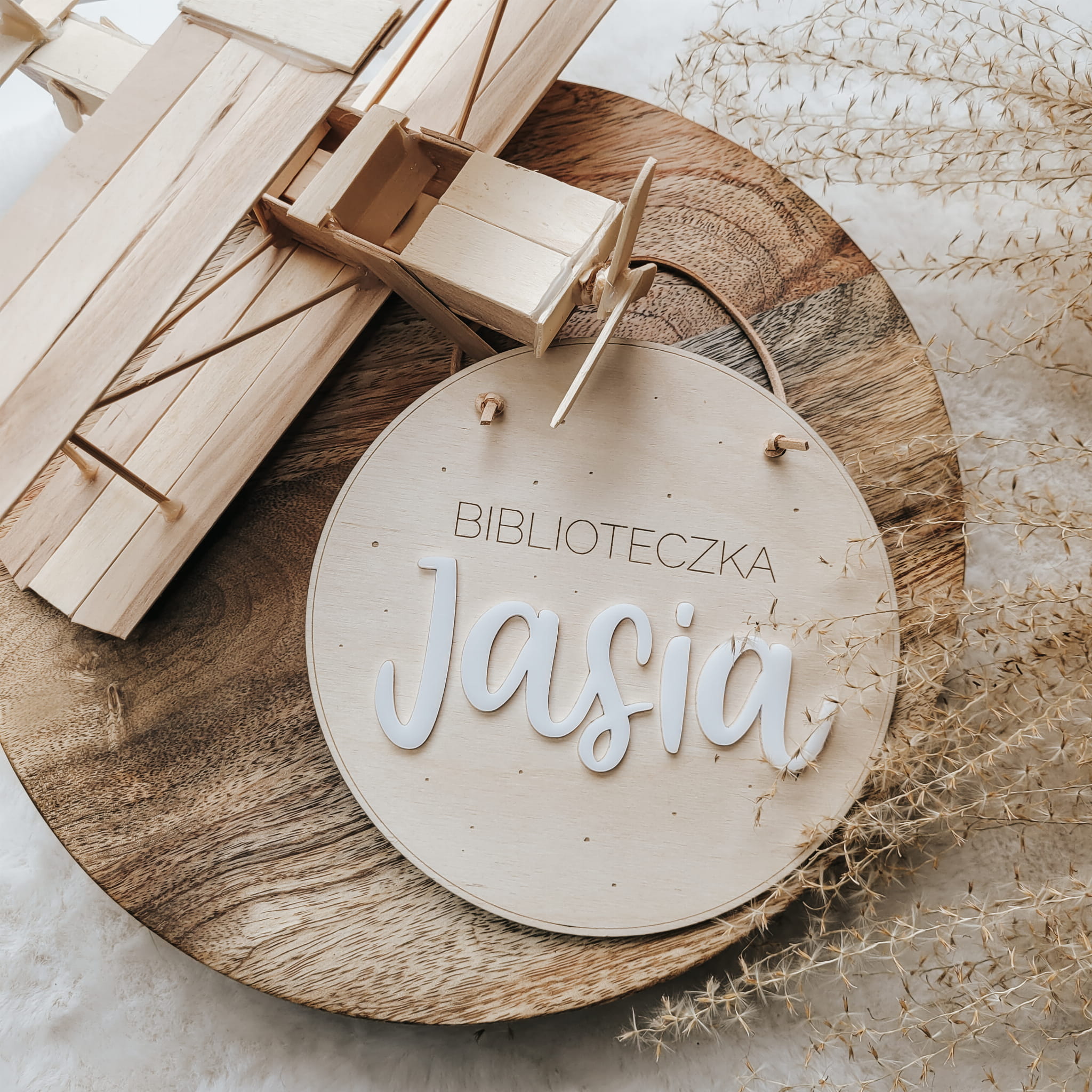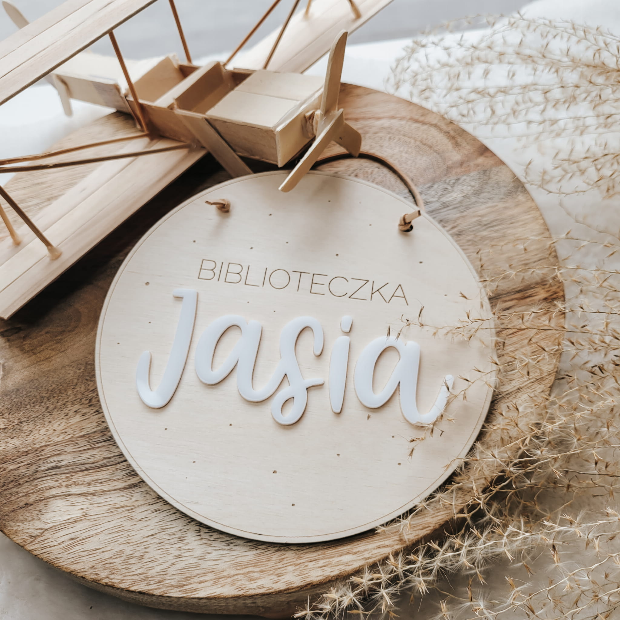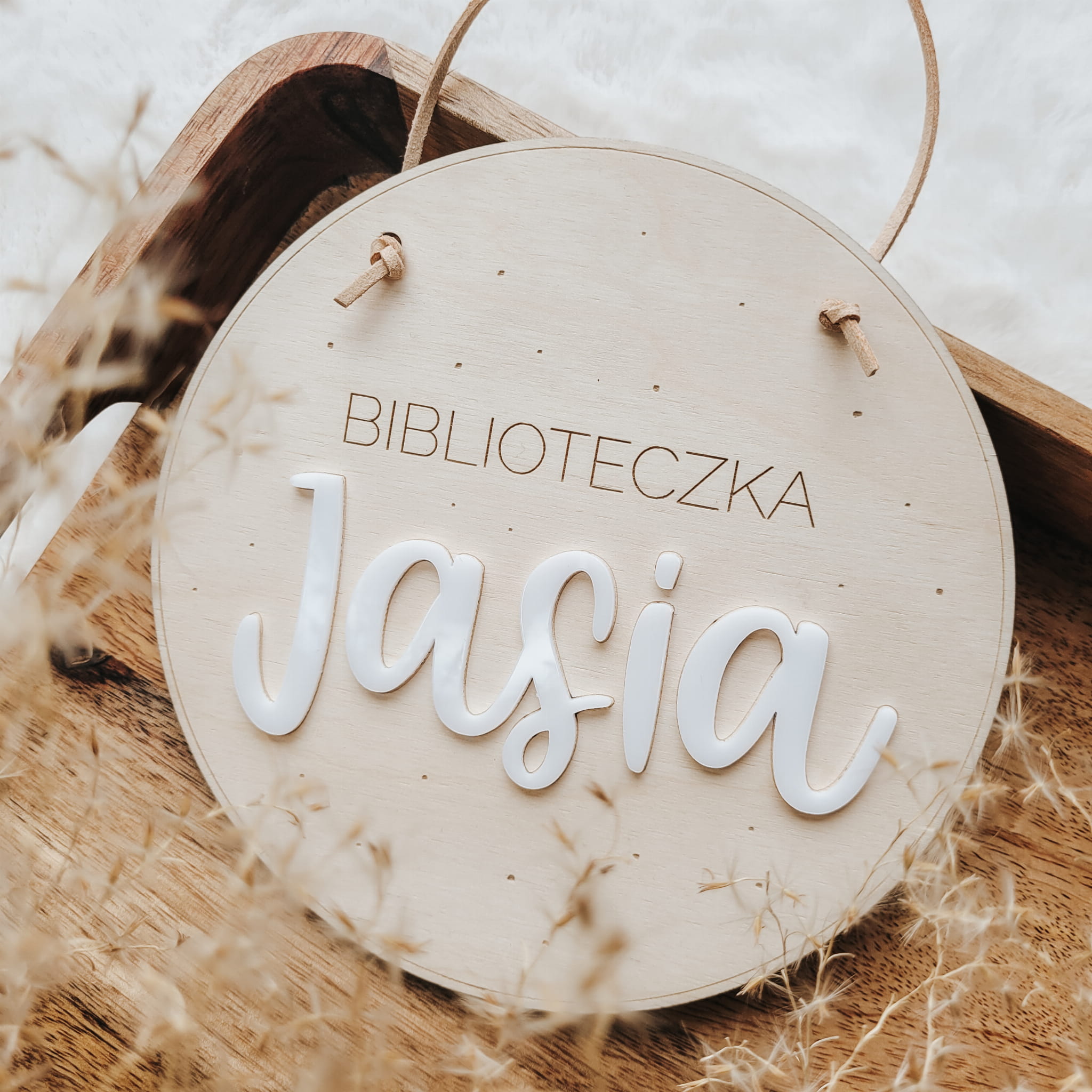 Drewniana zawieszka informacyjna z imieniem z białego pleksi.