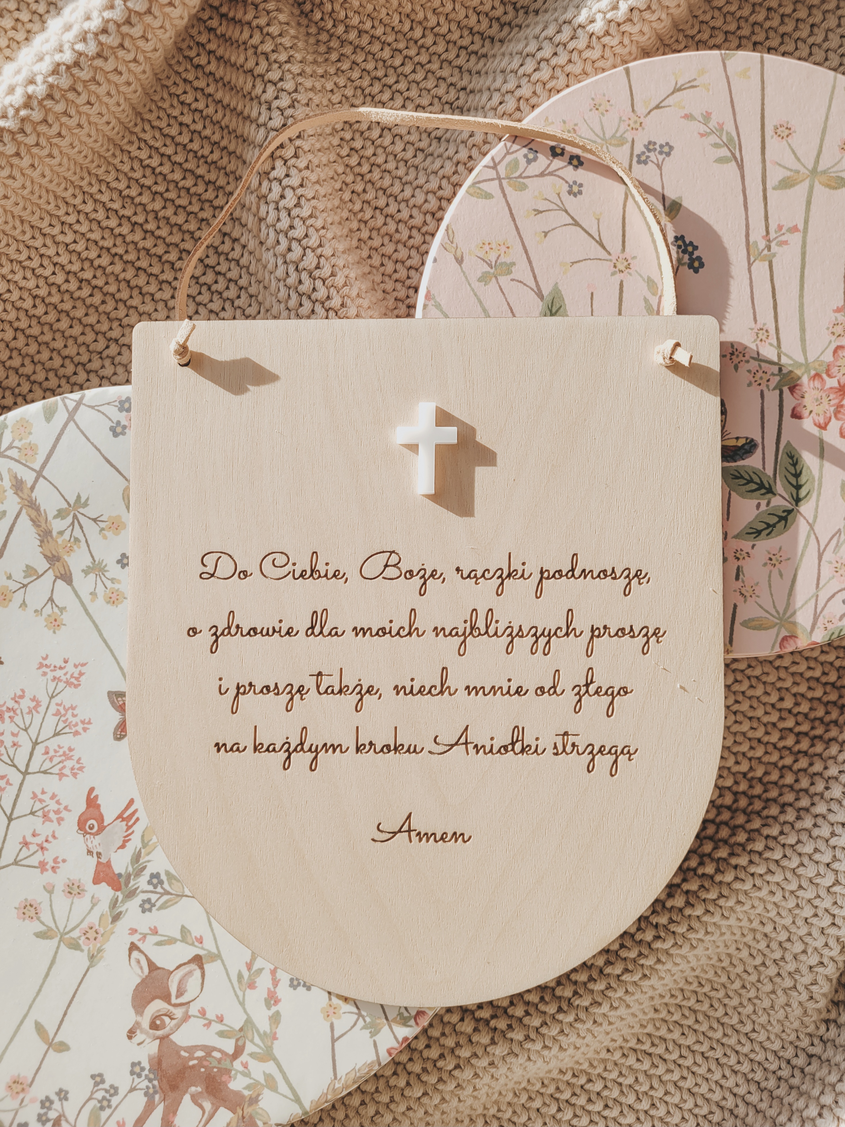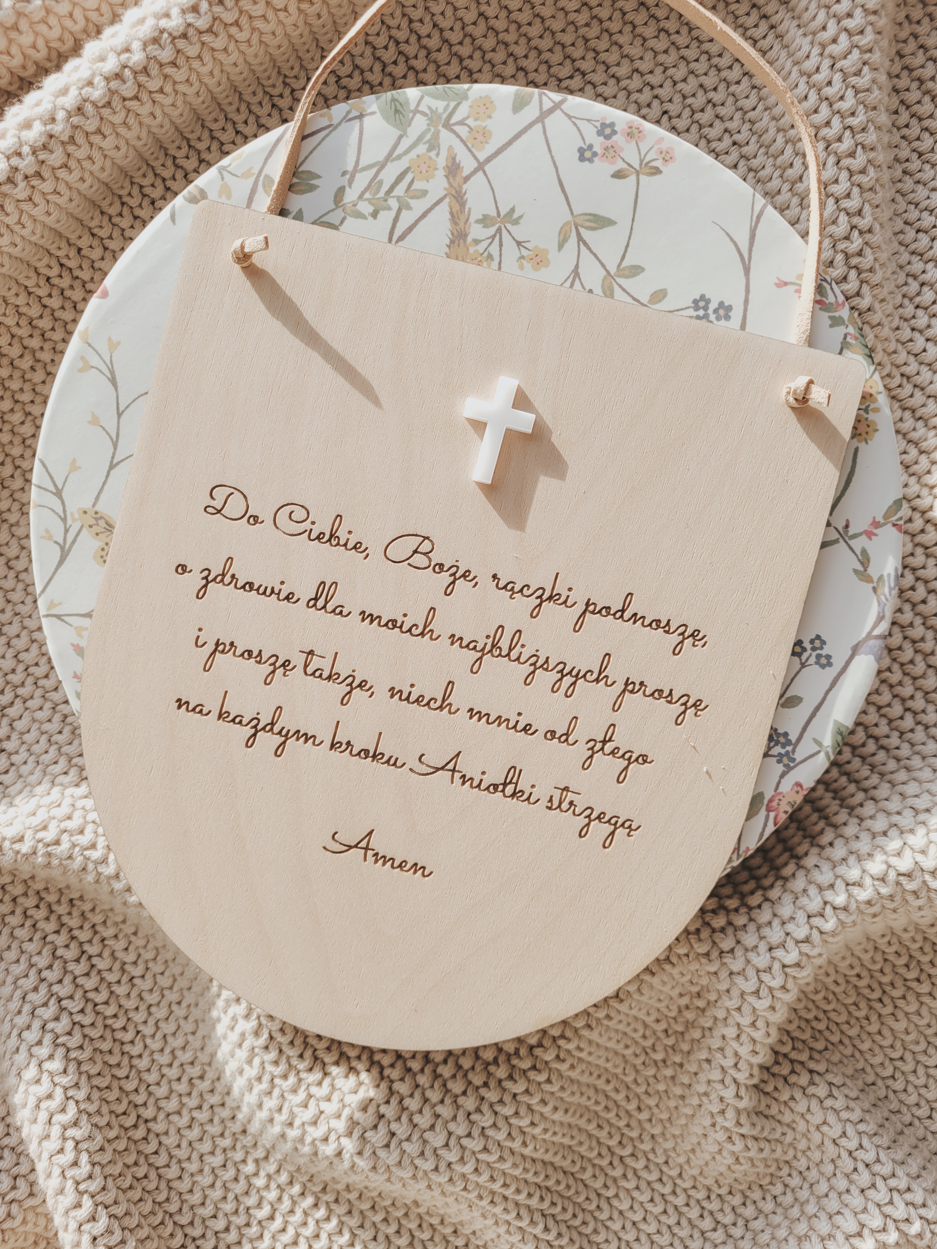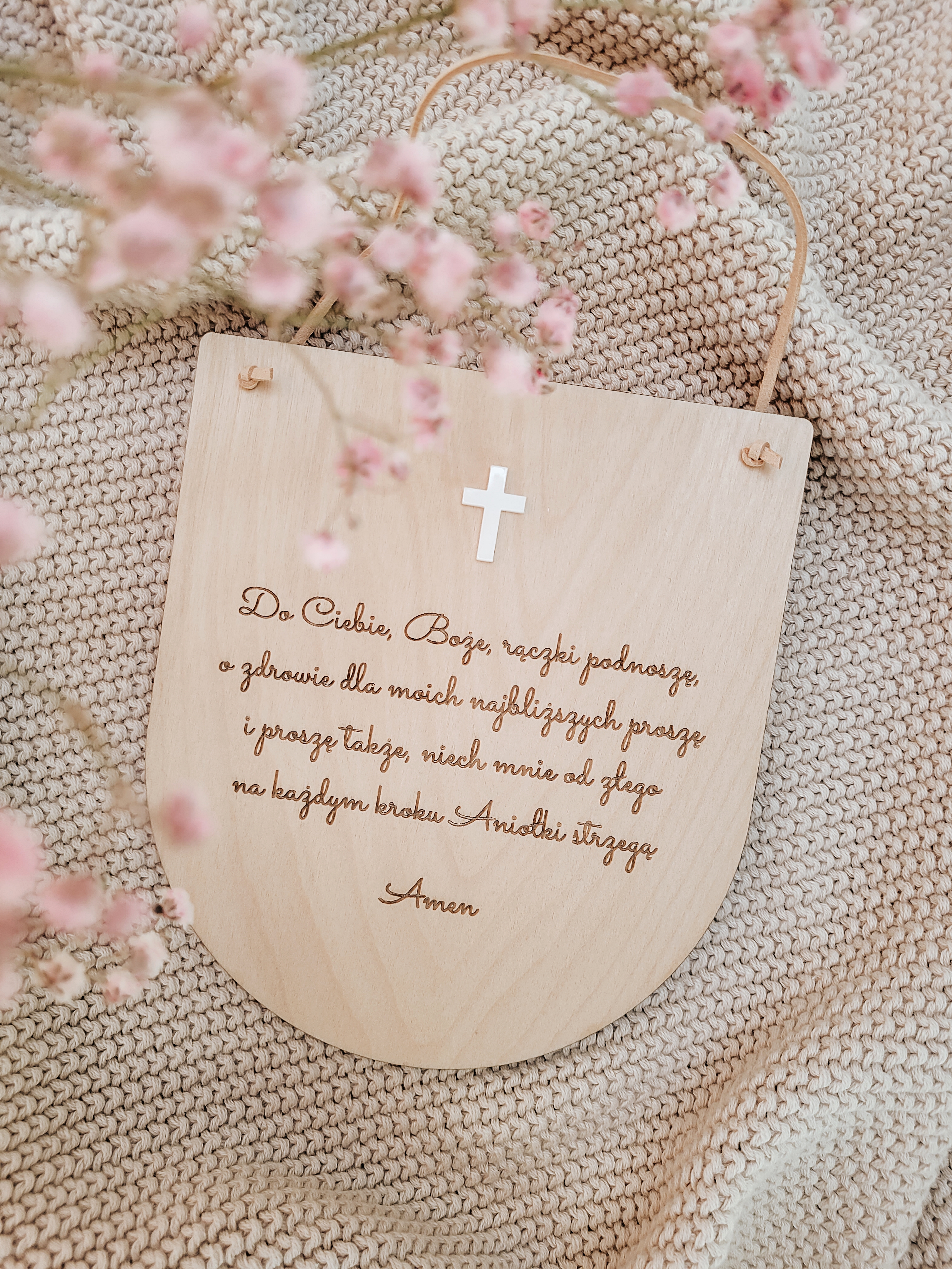 Drewniana zawieszka z modlitwą, ozdobiona delikatnym krzyżykiem z białej pleksy.