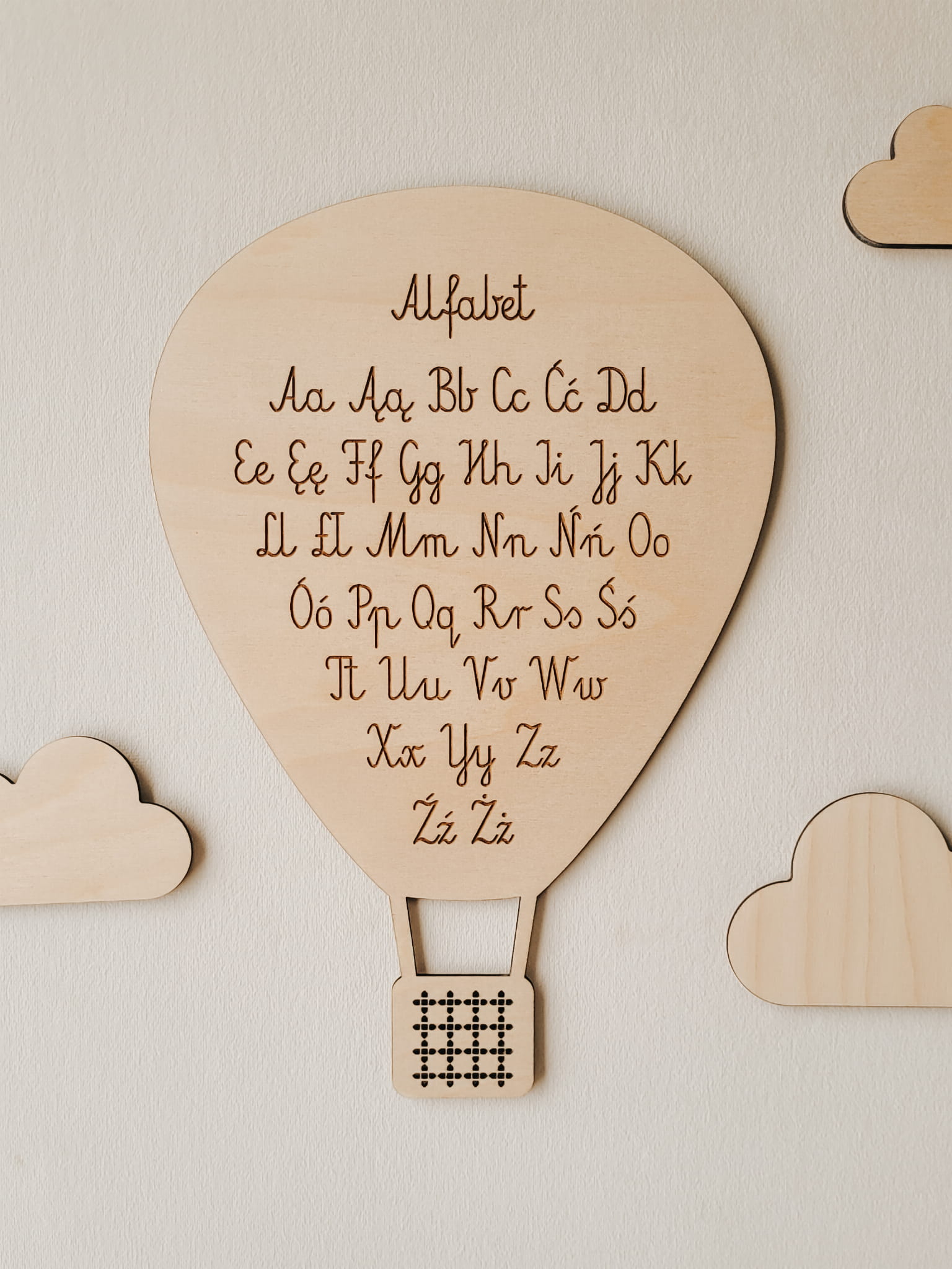 Alfabet zawiera wszystkie polskie litery. Grawerowany jest czcionką, której dzieci uczą się w zerówce i pierwszych latach szkoły.