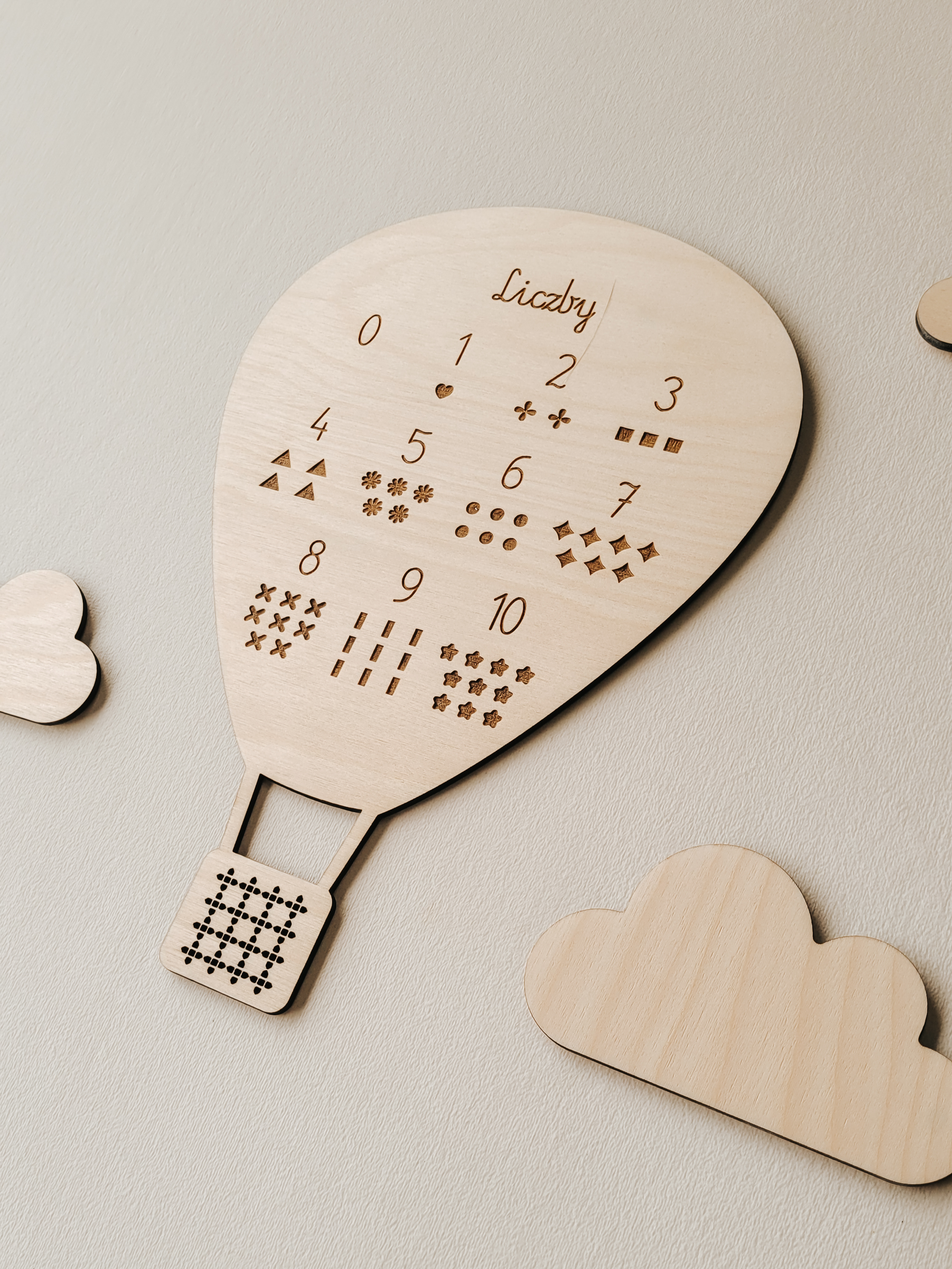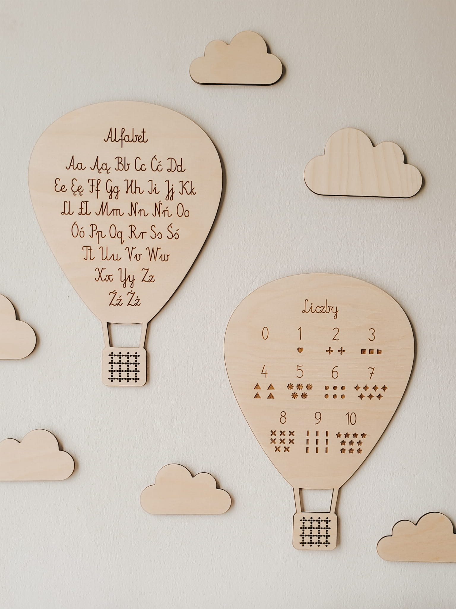 Zestaw dwóch drewnianych tablic w kształcie balonów z sześcioma uroczymi chmurkami do pokoju przedszkolaka, zerówkowicza lub ucznia edukacji wczesnoszkolnej.